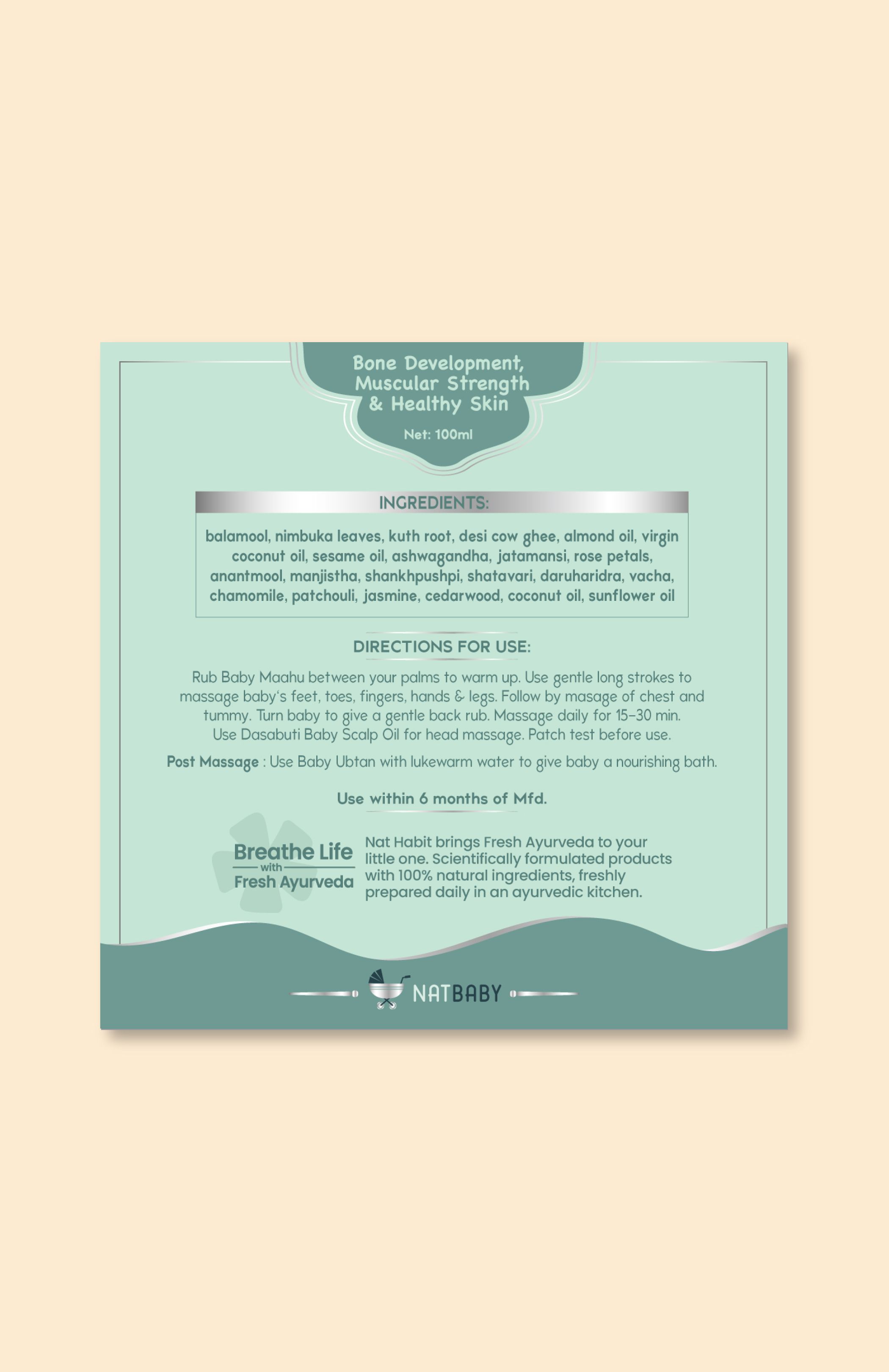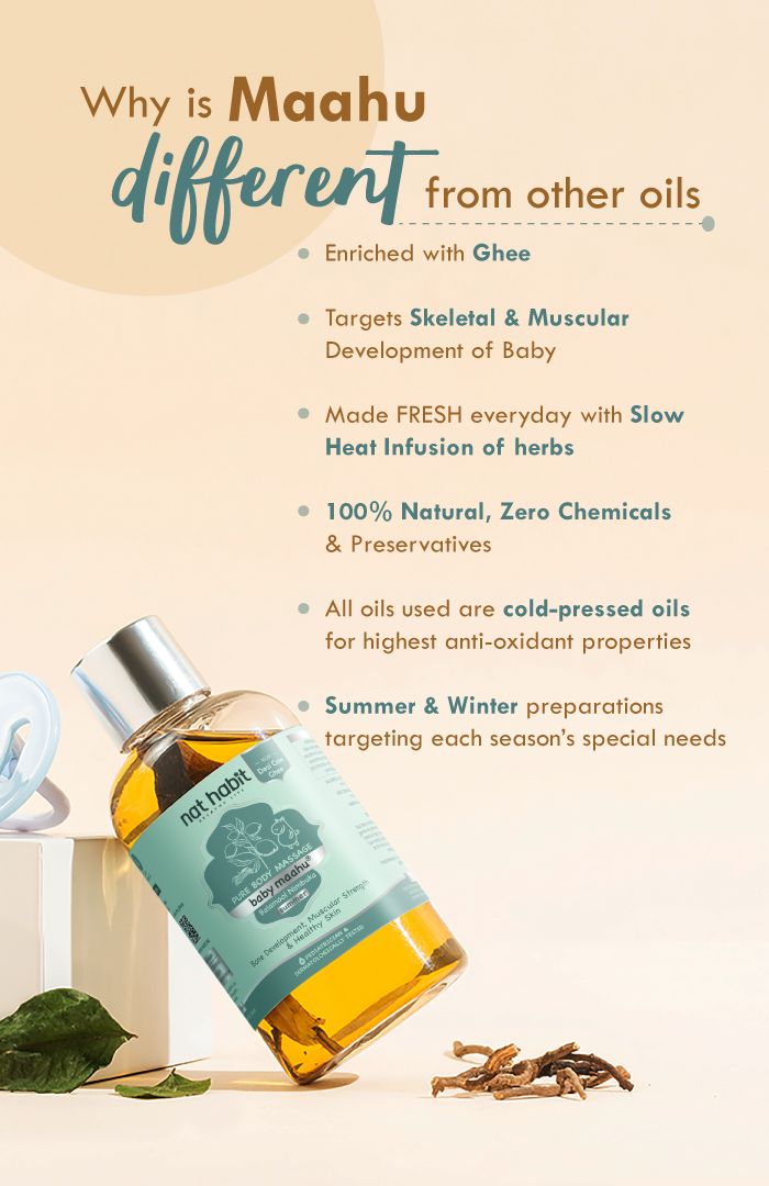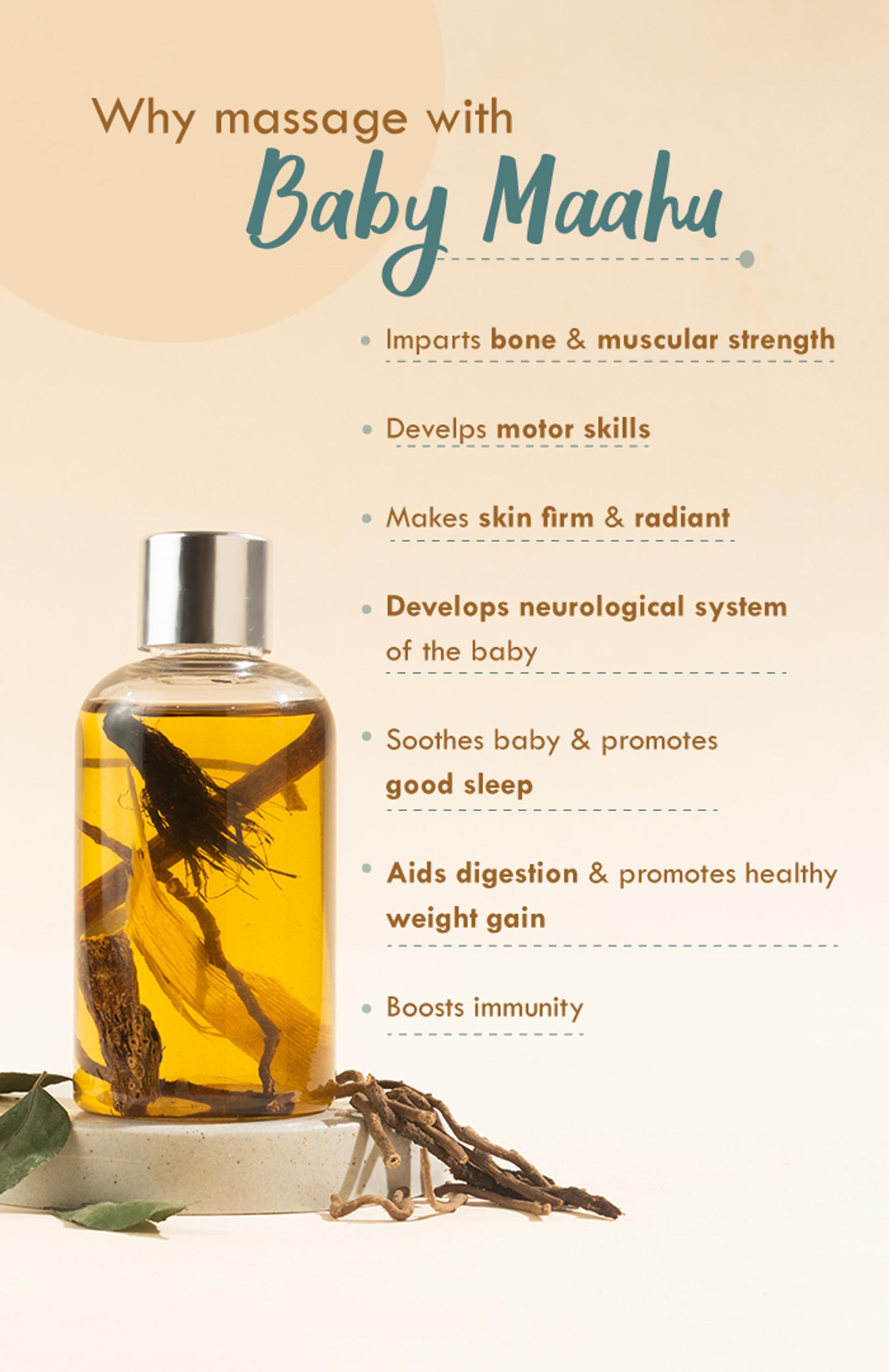 This Maahu Oil provides foundational nourishment for a baby’s early development phase to support stronger bones, firmer muscles, and healthier skin, while fortifying the body with antioxidants and strengthening actives - A holistic base for steady physical growth in the first crucial months.