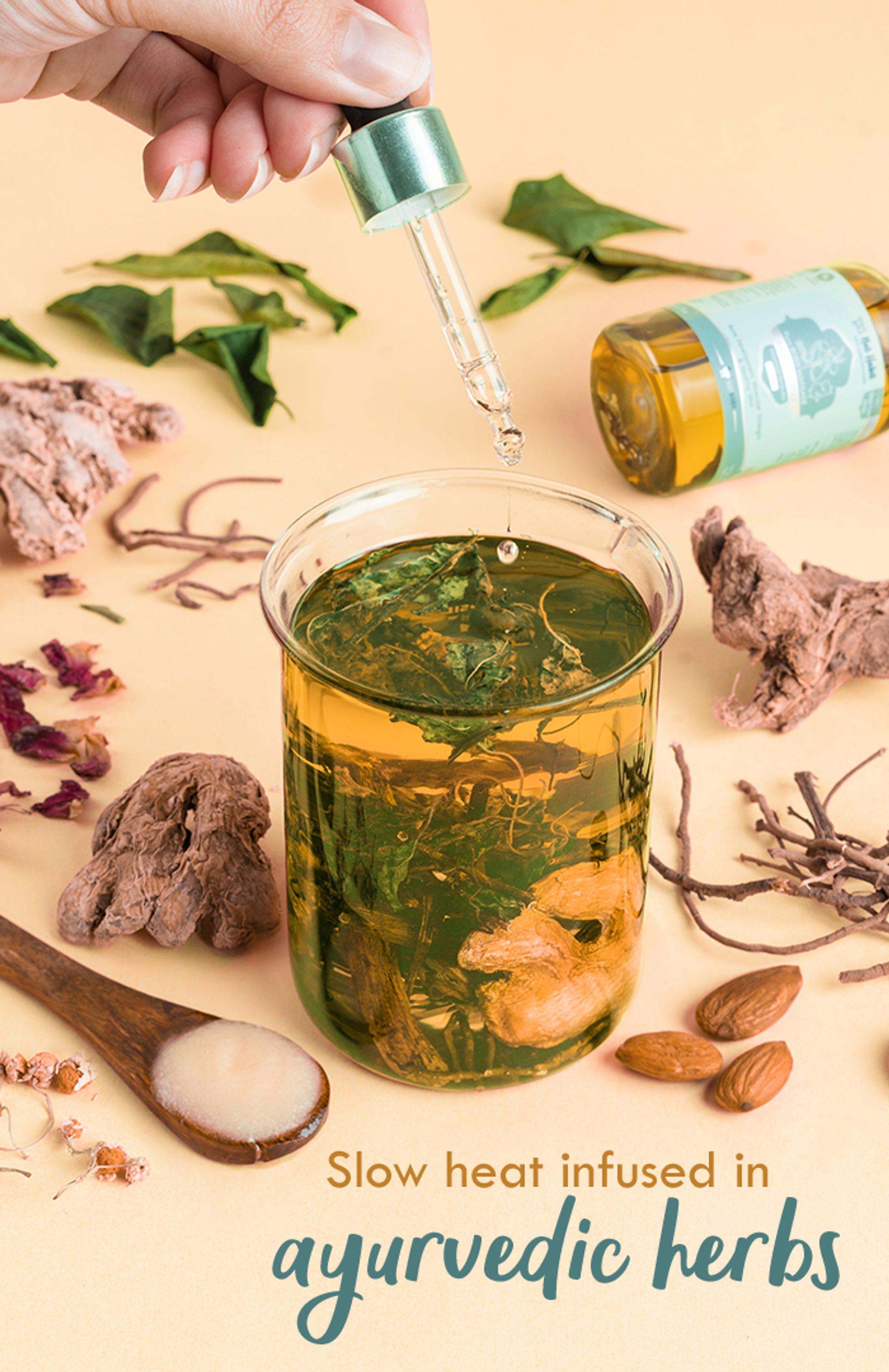 Full Ingredient List: Balamool, Nimbuka Leaves, Kuth Root, Desi Cow Ghee, Almond Oil, Virgin Coconut Oil, Sesame Oil, Ashwagandha, Jatamansi, Rose Petals, Anantmool, Manjistha, Shankhpushpi, Shatavari, Daruharidra, Vacha, Chamomile, Patchouli, Jasmine, Cedarwood, Coconut Oil, Sunflower Oil.