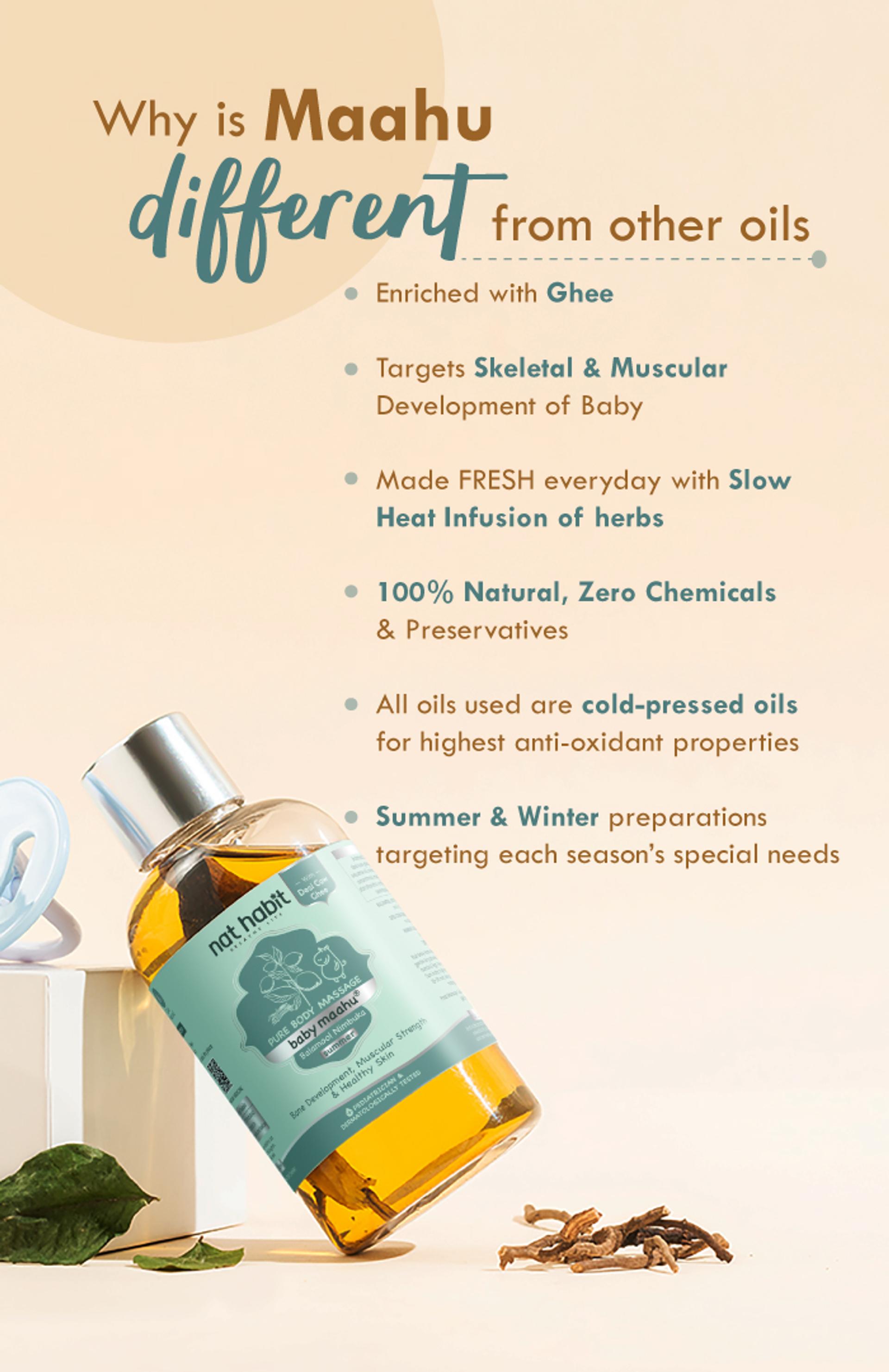 Made through slow-heat infusion to maximize herb potency, it is 100% natural, cold-pressed, preservative-free, and chemical-free - gentle & nourishing enough for daily newborn care. Paediatrician and Dermatologically tested, it is crafted to adapt to seasonal needs, providing warmth in winters, balance in summers, and steady protection year-round, keeping the baby comfortable and thriving in every climate.