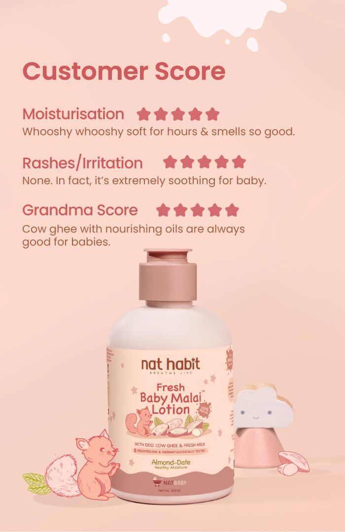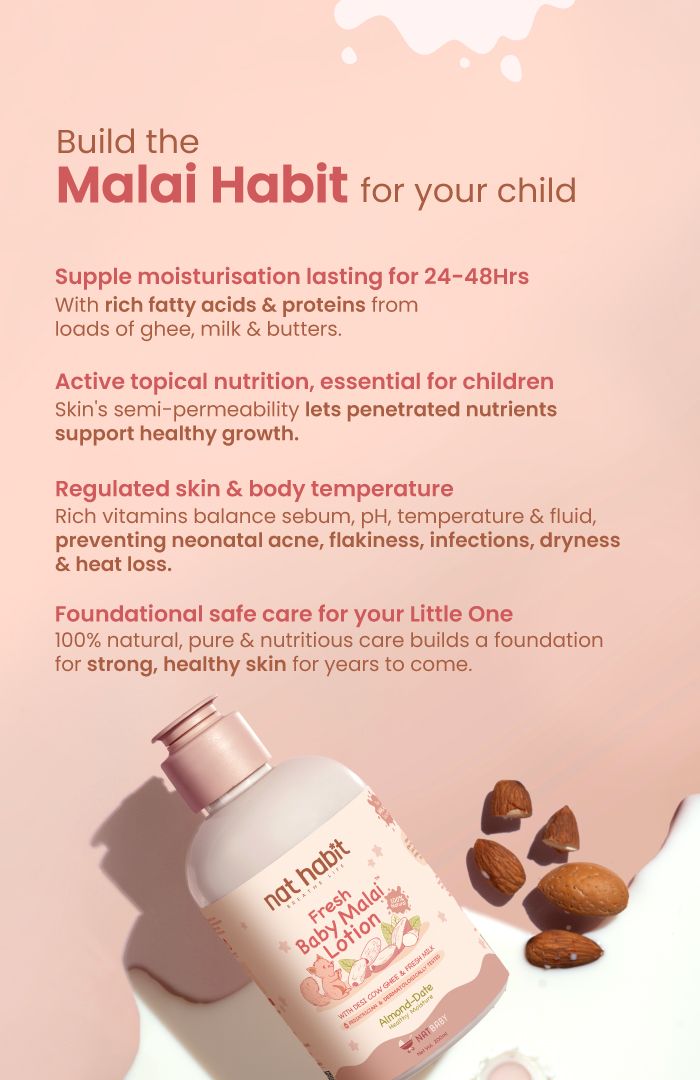 Baby’s semi-permeable skin absorbs the richness of Malai’s active vitamins, fats, proteins, & nutrients. It delivers deep moisture, removes flakes, protects the skin, helps regulate their body temperature, leaving MALAI-soft, supple skin with loads of giggles. MALAI care - 100% Natural. 0% Chemicals. Paediatrician & Dermatologically Tested.