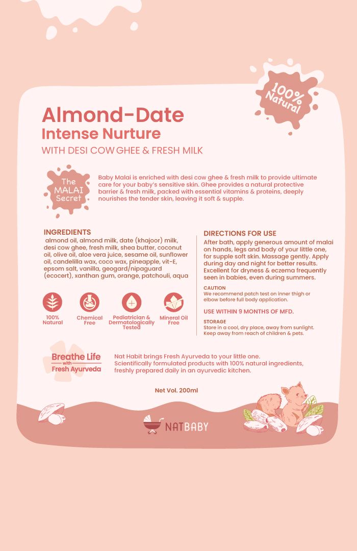 MALAI infuses baby skin with almond and date milk vitamins, minerals, amino acids, and soothing nutrients that strengthen the developing skin barrier. These nutrient-dense milks support healthy cell growth, improve moisture retention, and keep delicate skin velvety soft, calm, and naturally radiant.