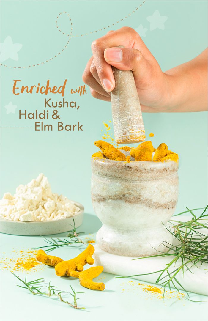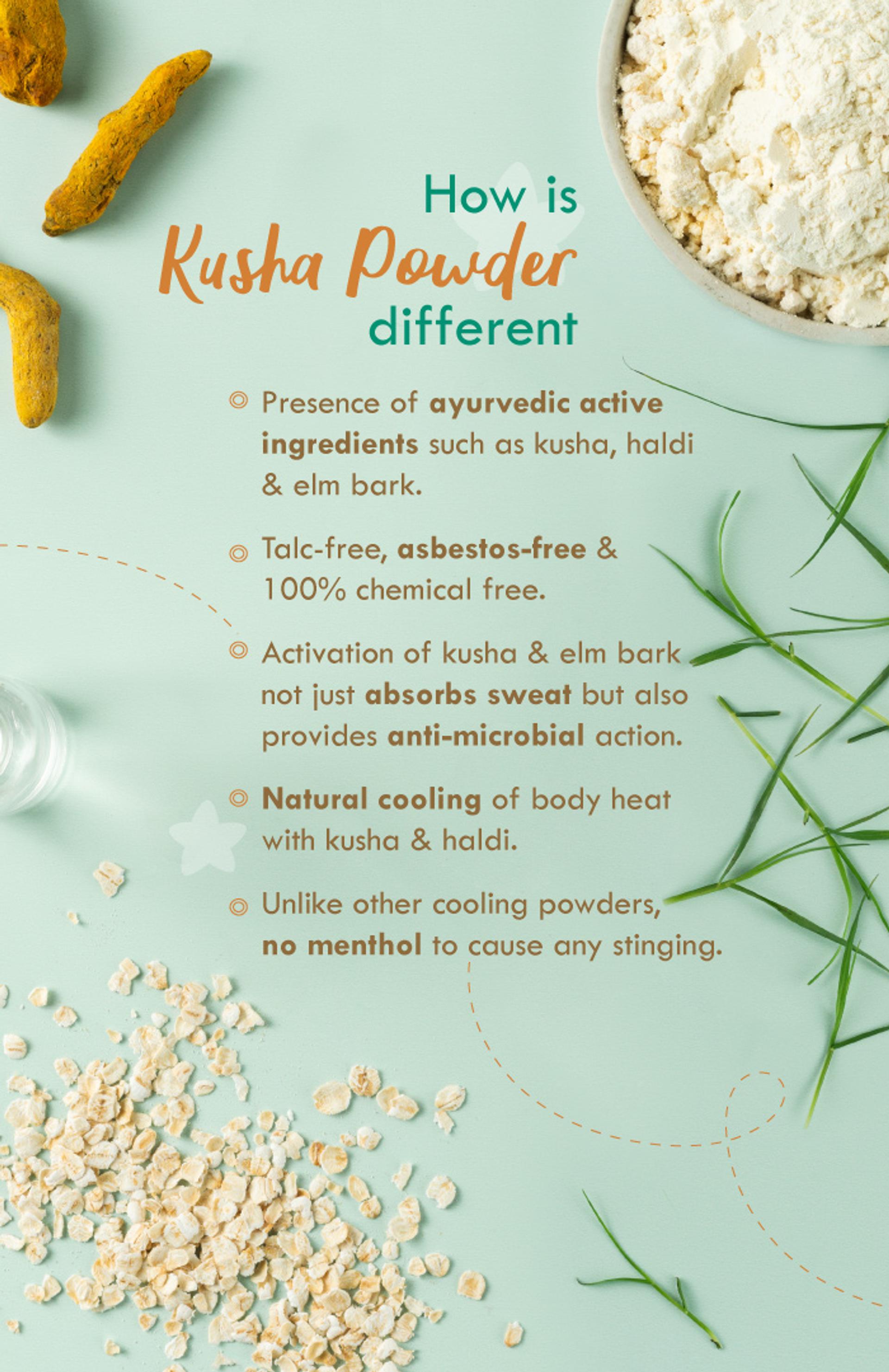 Full Ingredient List: Kusha (darbha), Wild turmeric, Corn starch, Tapioca starch, Arrowroot, Rolled oats, Elm bark, Neem, Kaolin clay, Champa, Lavender