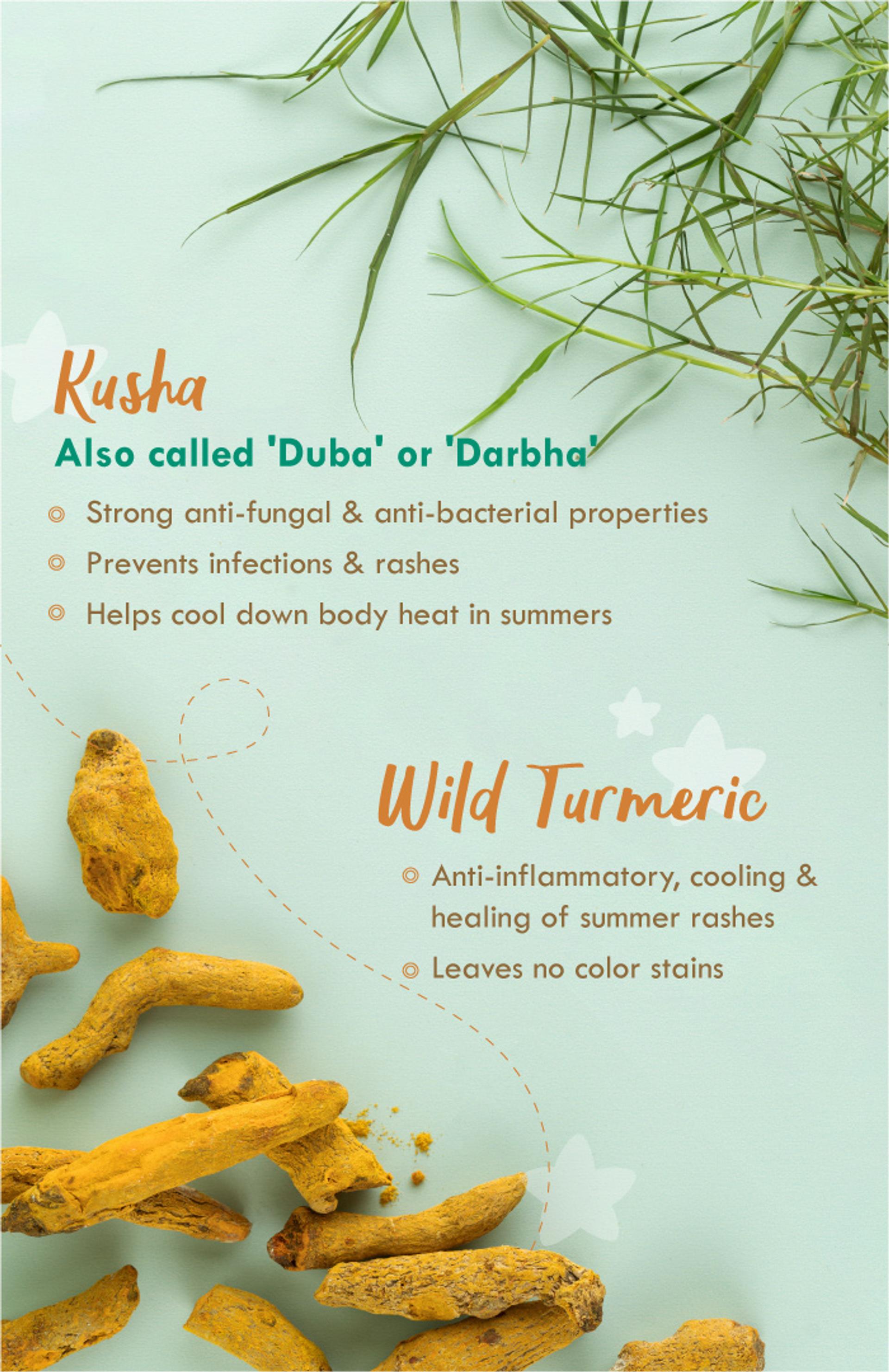 Wild turmeric (kasturi manjal) offers added potent antibacterial, antifungal, and anti-yeast activity - ideal for preventing and managing diaper rashes, sweat rashes, and skin infections.
