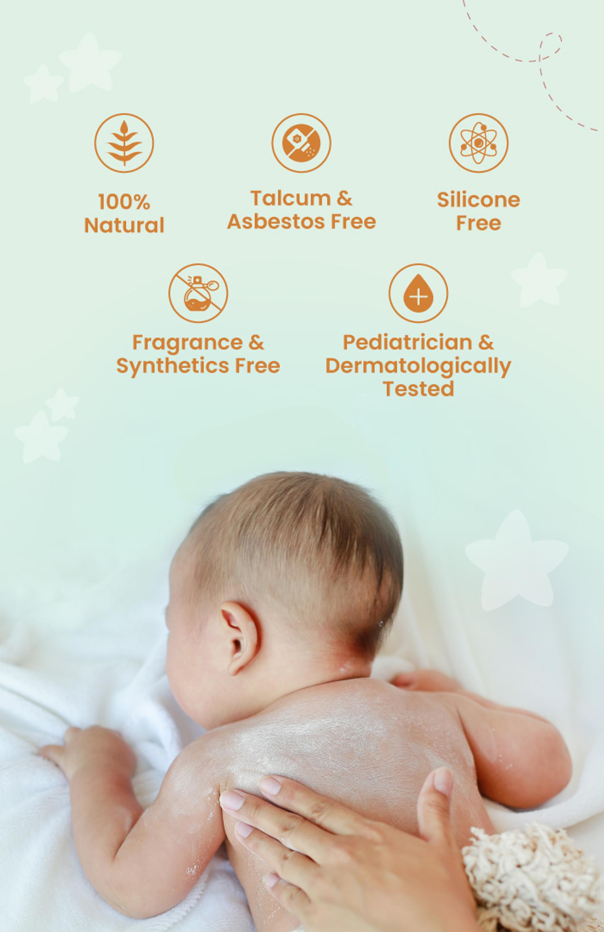 Formulated without talc, asbestos, menthol, or chemicals, it relies purely on natural, safe ingredients that maintain skin neutrality and prevent barrier disruption. Dermatological and paediatric evaluation ensures it is non-irritating and safe for daily use on newborn to toddler skin.