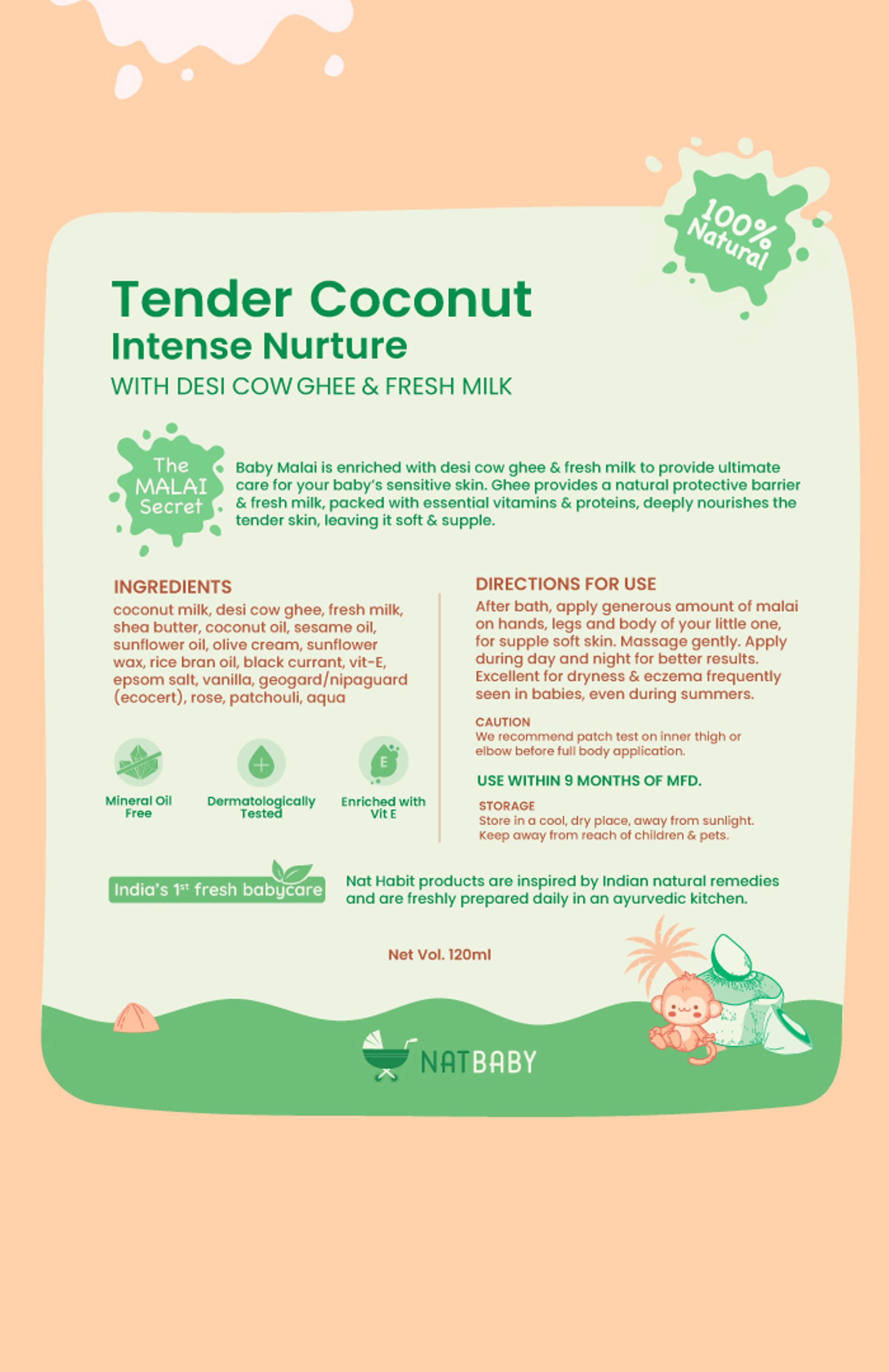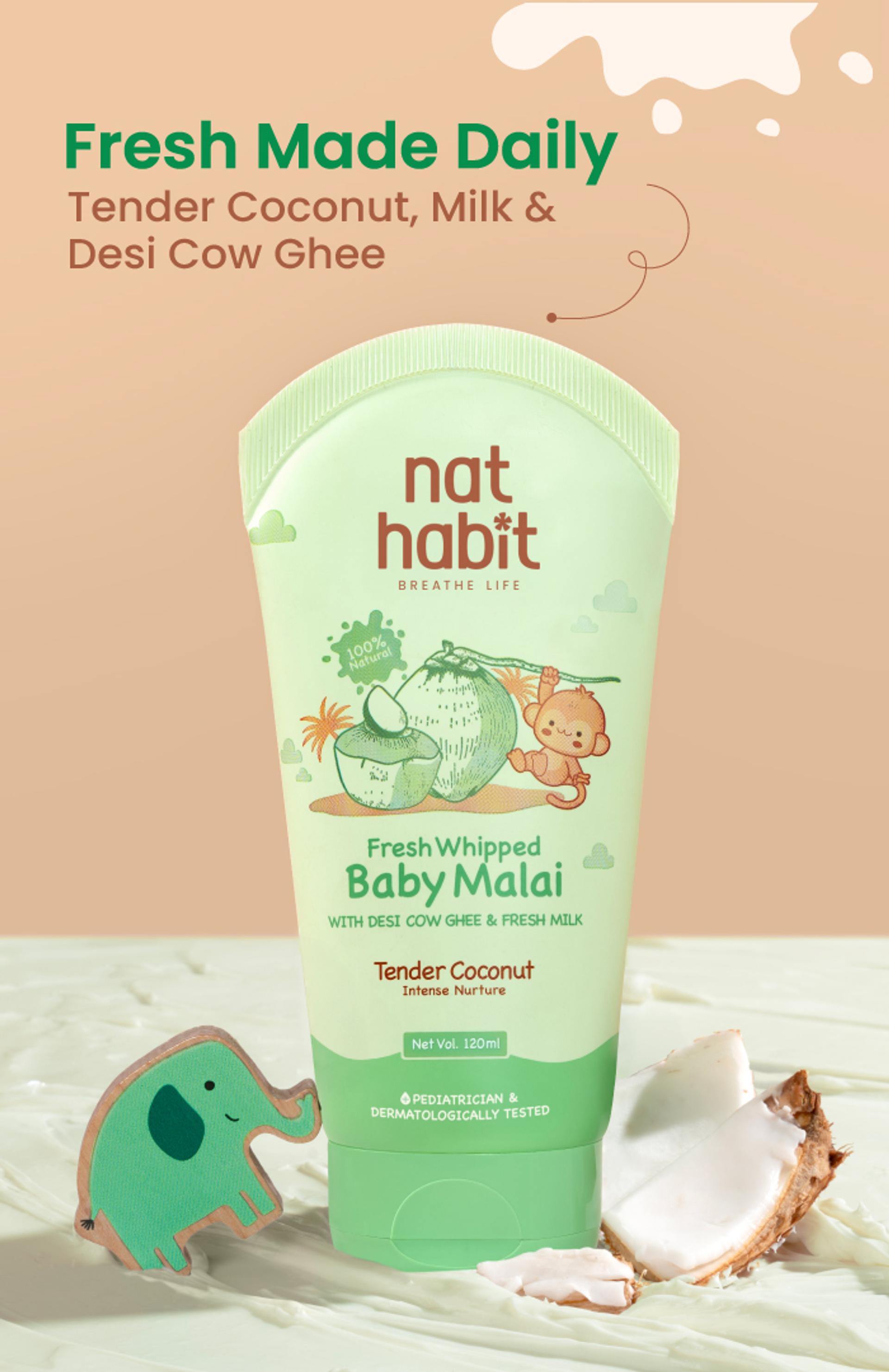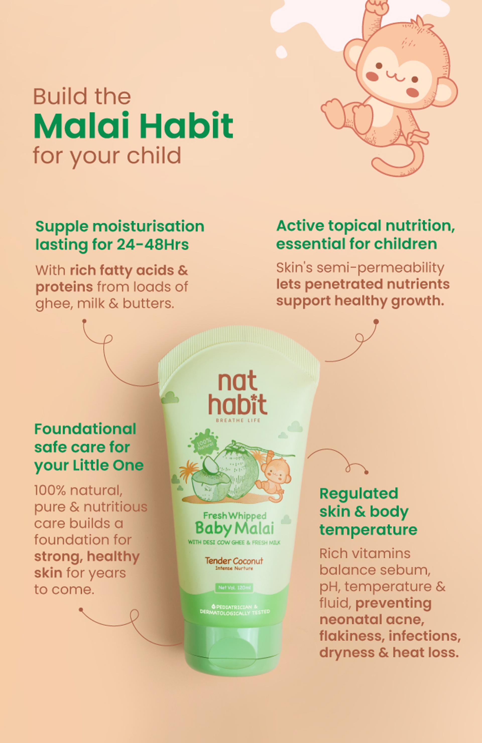 Baby’s semi-permeable skin absorbs the richness of Malai’s active vitamins, fats, proteins, and nutrients. It helps in delivering deep moisture, protecting the skin barrier, and helping regulate their body temperature to leave soft, supple skin with loads of giggles. MALAI care - 100% Natural. 0% Chemicals.