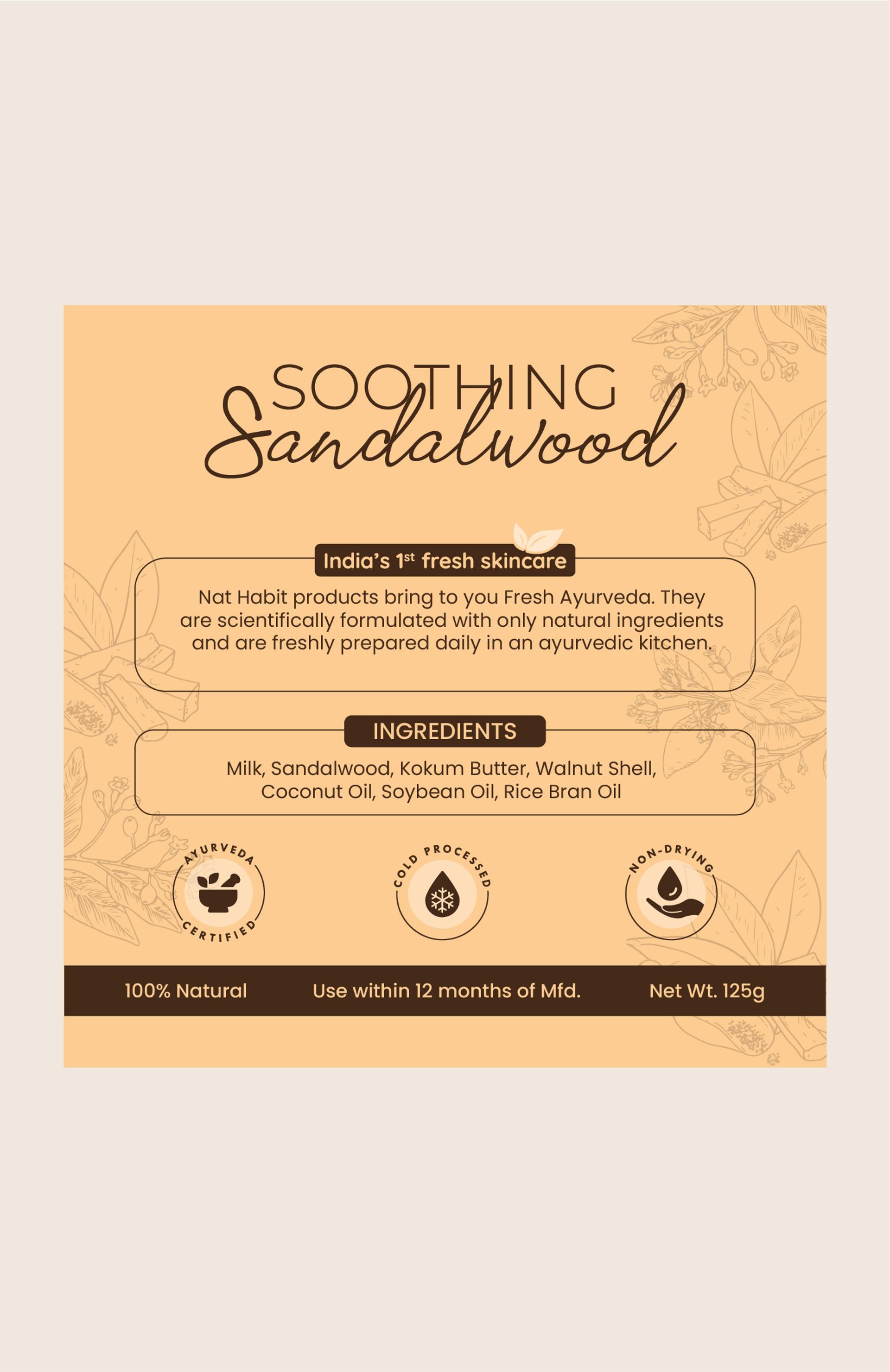 Full ingredient list: Milk, Sandalwood, Kokum Butter, Walnut Shell, Coconut Oil, Soybean Oil, Rice Bran Oil