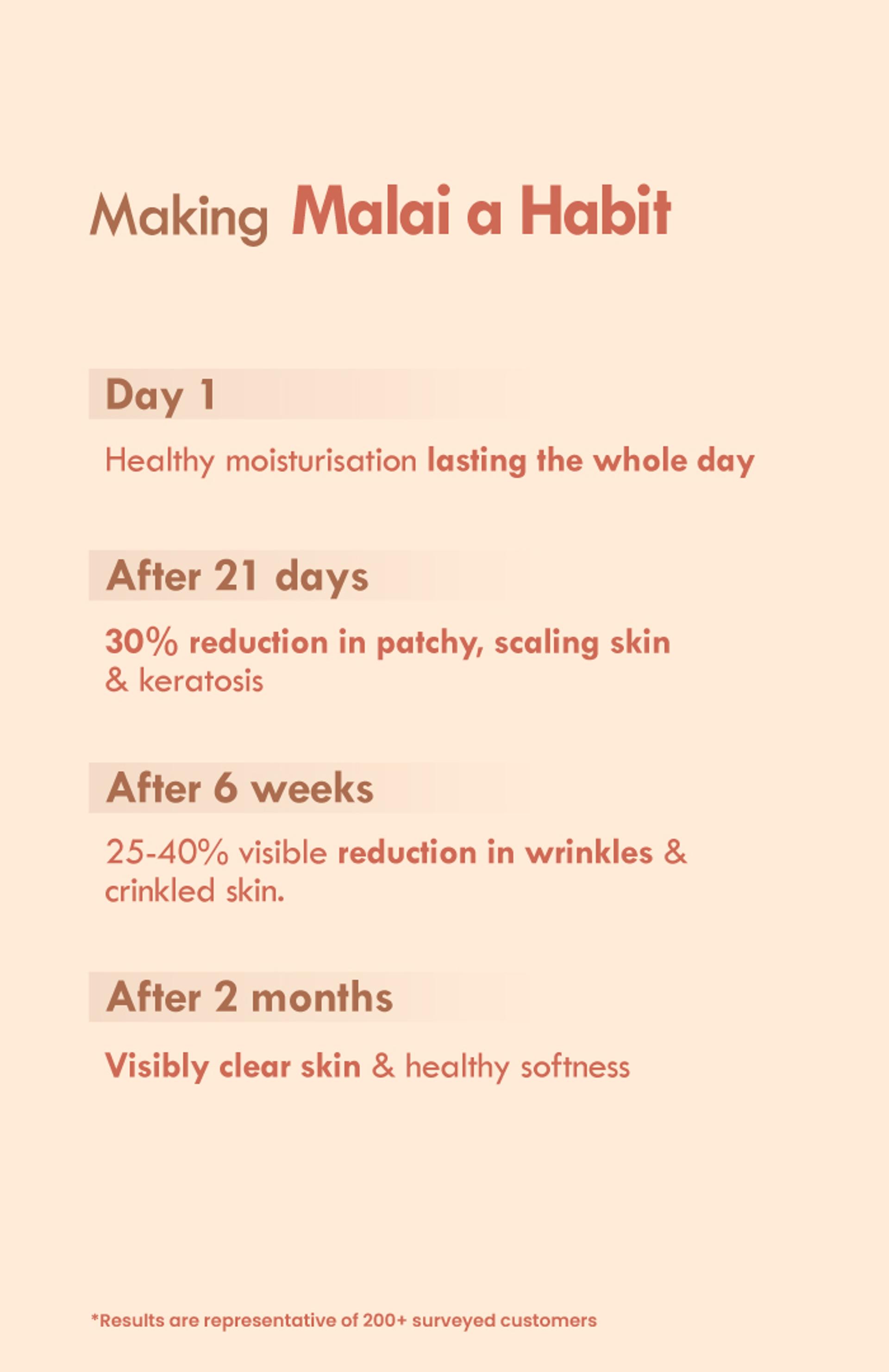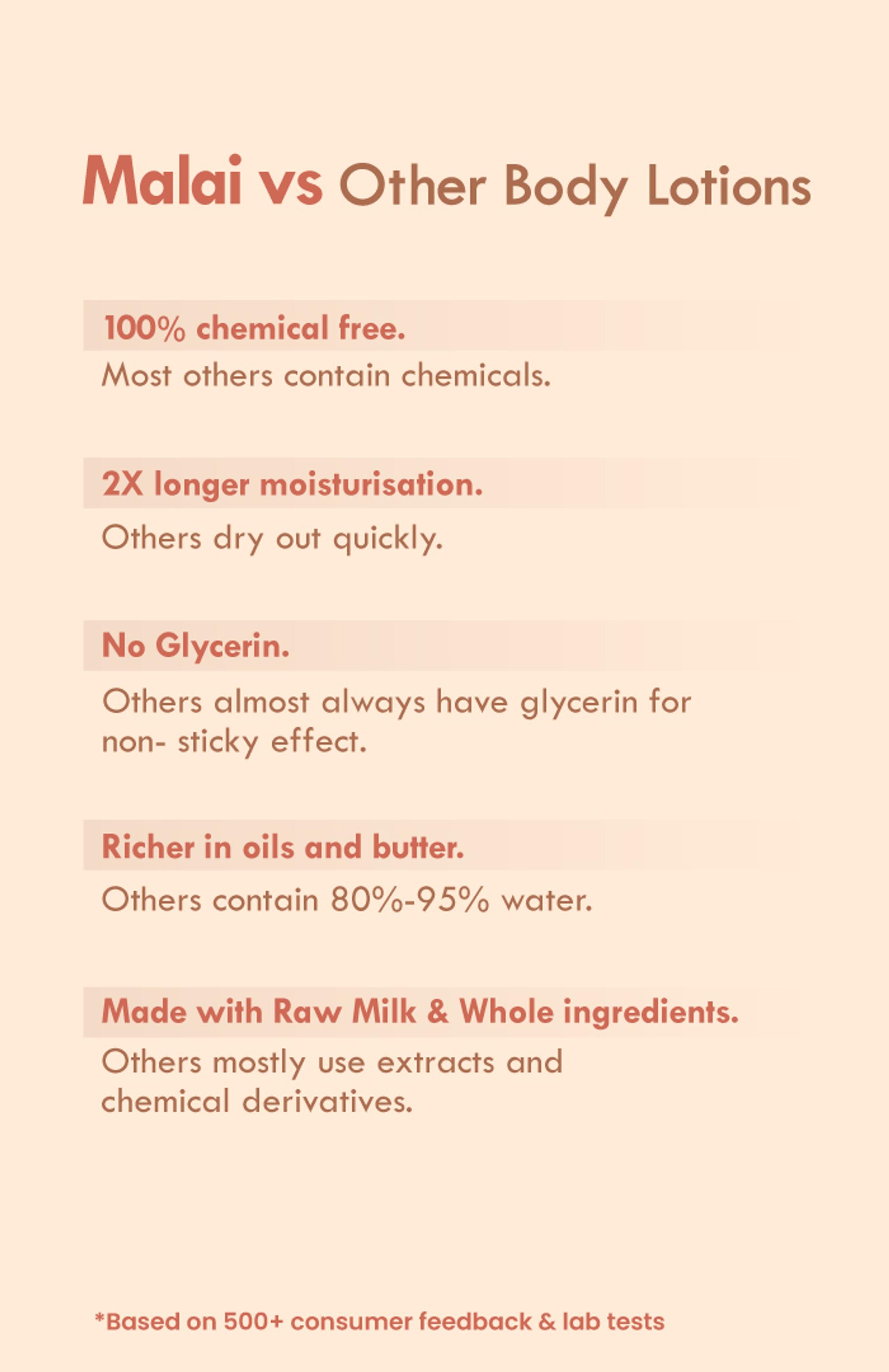 Body Malai Lotion is made of fresh raw milk for full body moisturisation. It is glycerin-free and deeply softens, hydrates, nourishes & repairs skin to give 48HR intense protection. Packed with cocoa butter, shea, walnut, almond, sesame & the goodness of sunflower seeds, olive cream, raw milk & more. Once you use a freshly made Malai Lotion, you'll never want to go back to regular lotions! We promise!