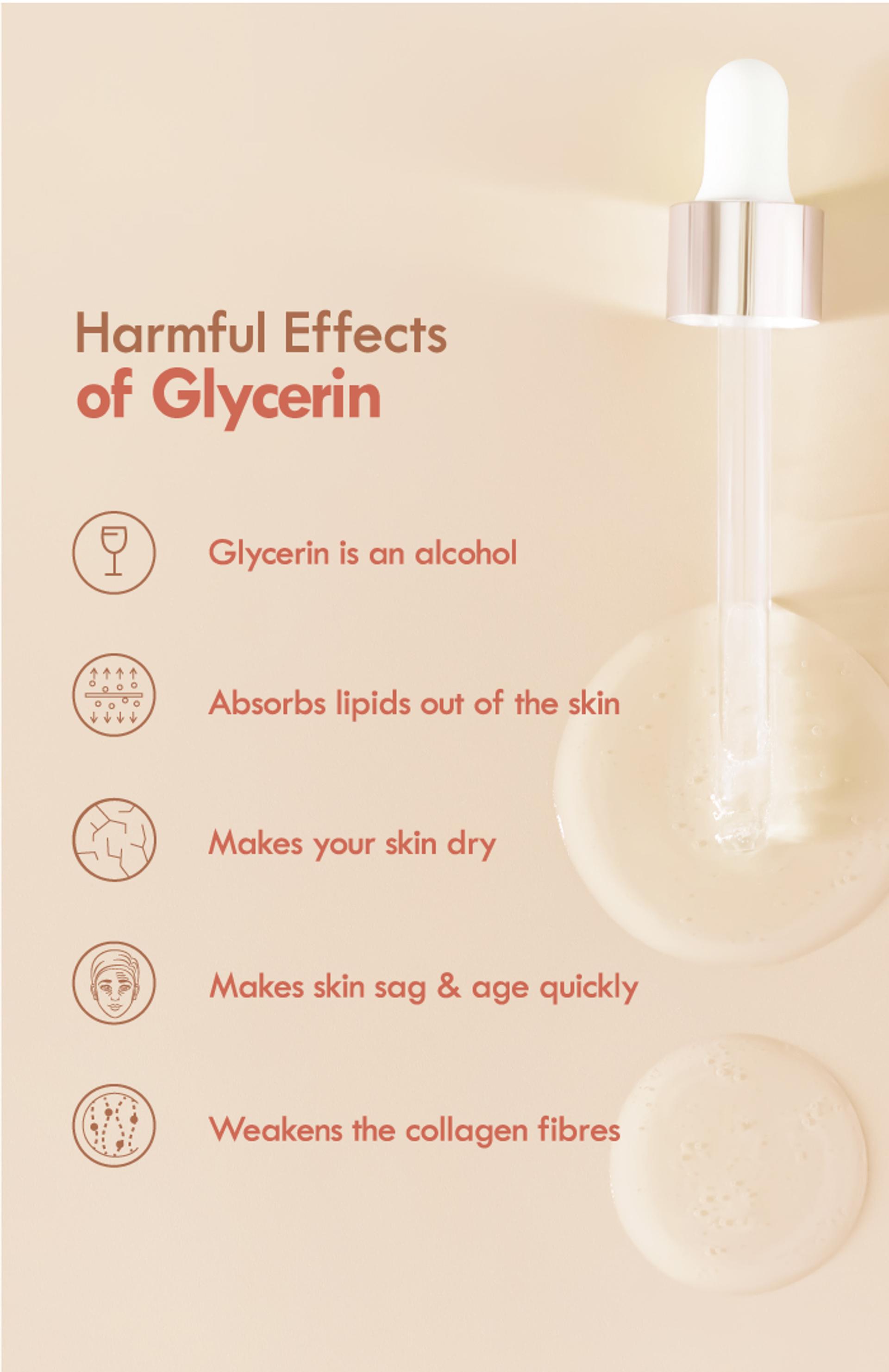 Glycerin often gives the illusion of moisturised skin because it makes the surface feel soft and supple immediately after application. However, this is often superficial and short-lived. In reality, it may leave the deeper skin layers more vulnerable.
