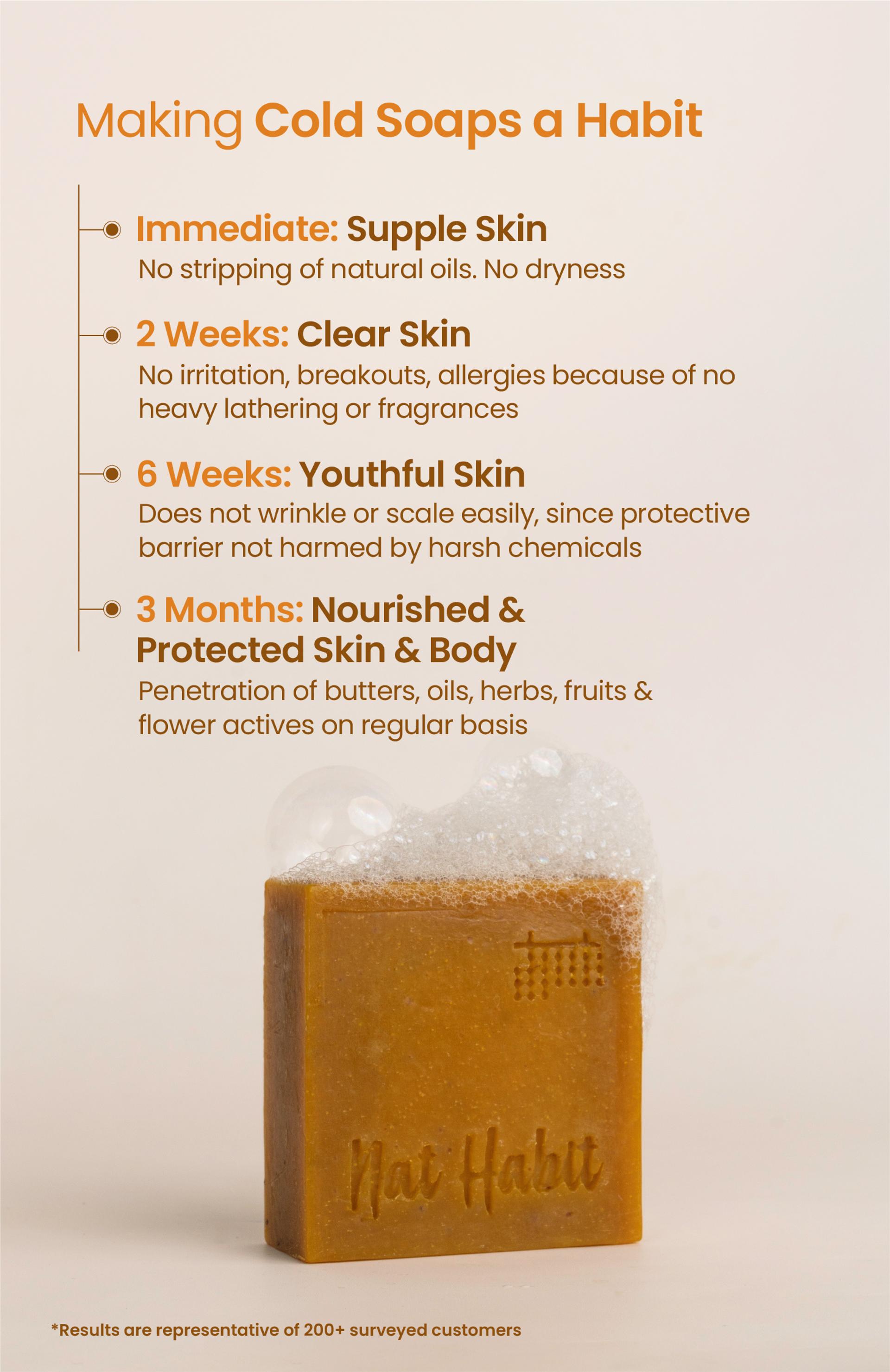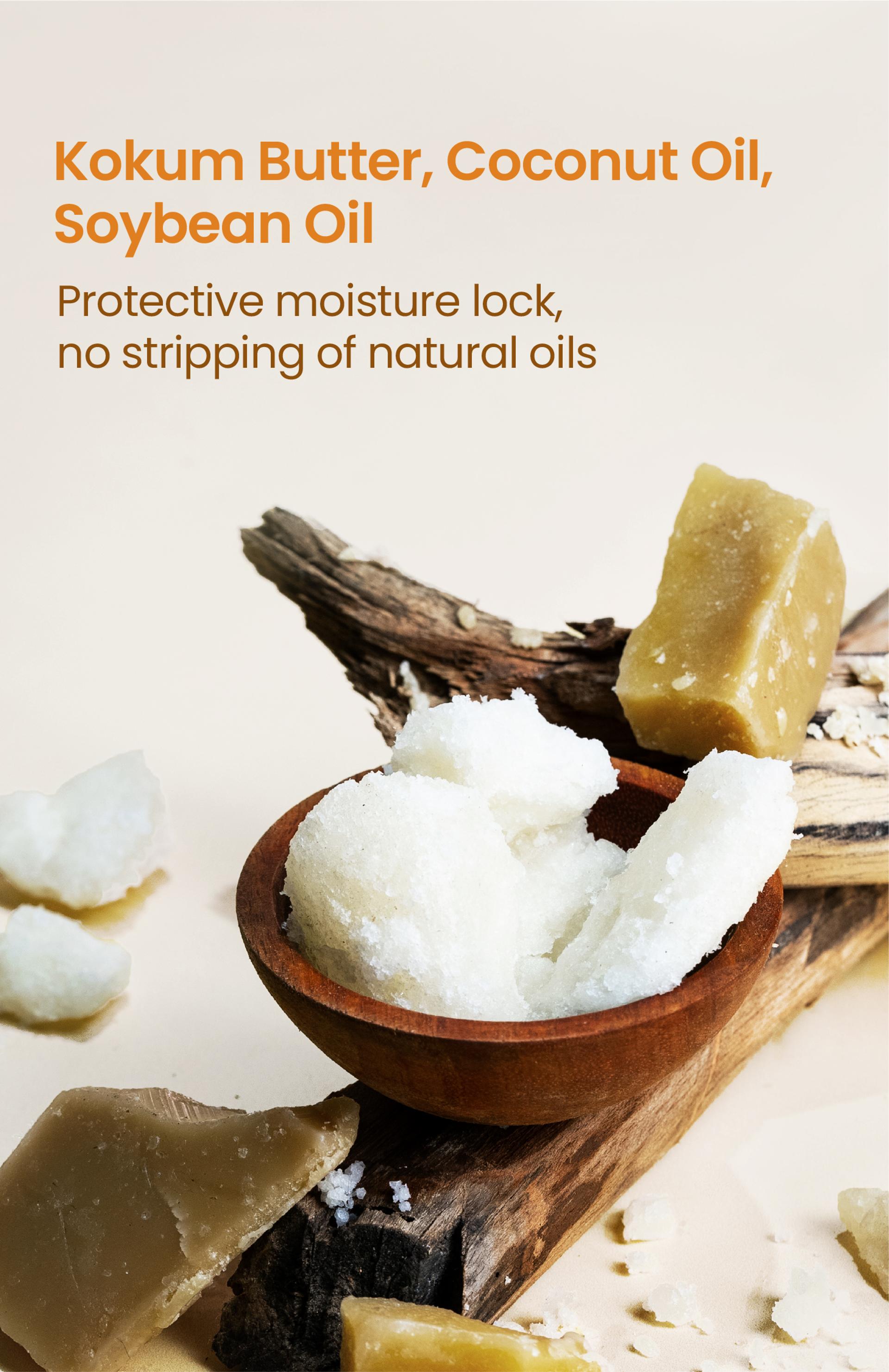This soap is crafted entirely from scratch using pure plant butters & oils, unlike other bars made from pre-existing soap bases. Through the tedious cold-process saponification method, these oils undergo slow alkaline hydrolysis, forming fatty acids and glycerol. Over 6–8 weeks, the fatty acids gradually transform into soap molecules, retaining the naturally formed glycerin, volatile organic compounds of plant butters, oils & rich fatty matter intact in the final bar.