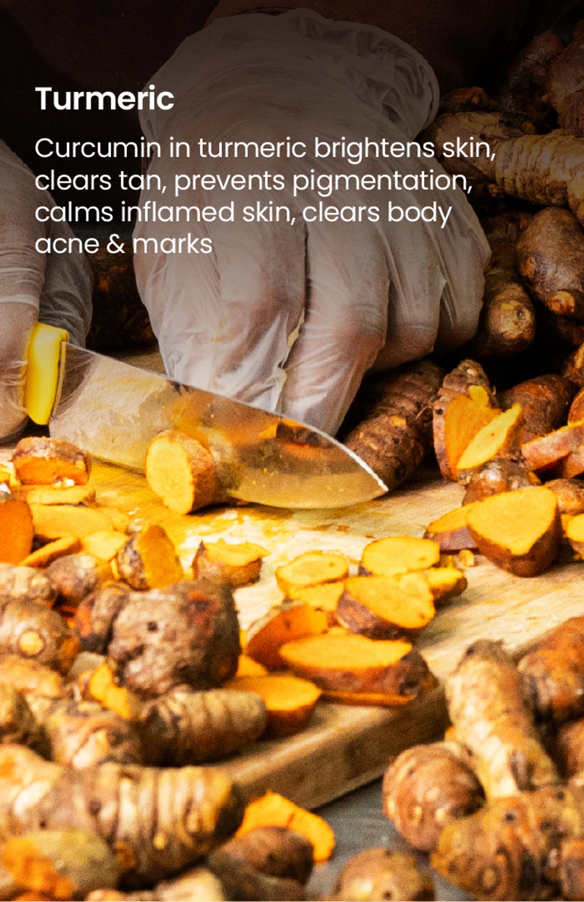 Uplifts bathing with detanning, melanin inhibiting compounds of Wild Turmeric.