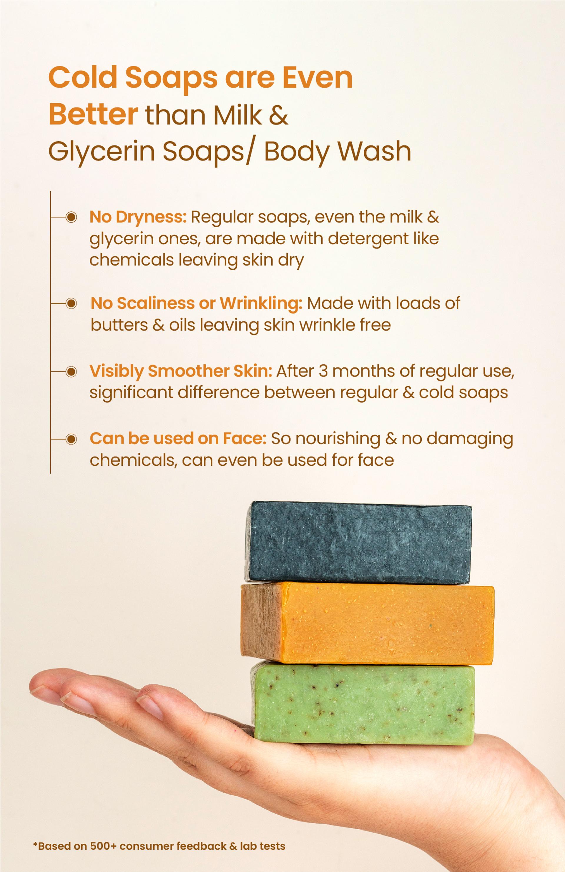 Unlike conventional soaps and bodywashes built on synthetic surfactant bases, artificial fragrances, chemical preservatives, and isolated extracts, this cold-processed soap is made entirely from scratch using pure oils without any external additives. No synthetic stabilisers, fragrance molecules, chemical bleaches or preservatives. Just a pure bar of natural care.