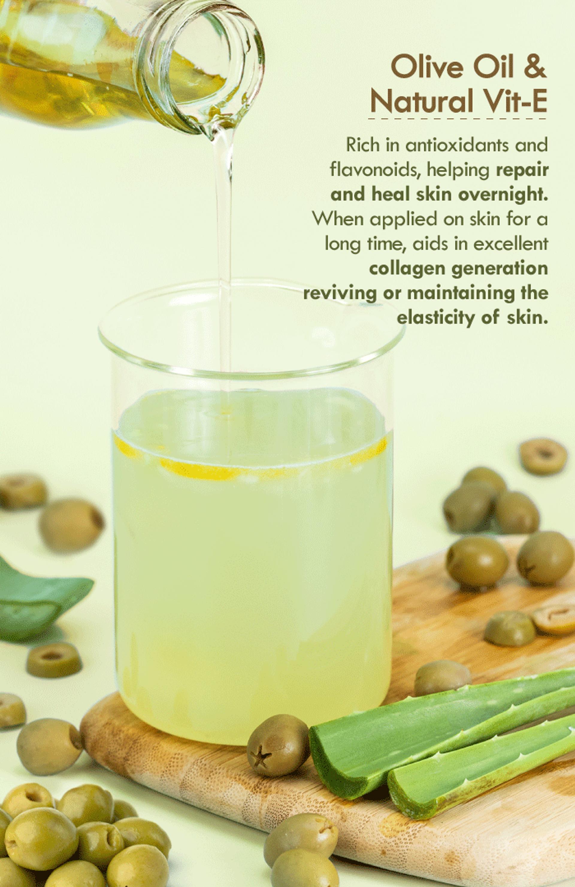Olive oil’s vitamin E and polyphenols neutralise free radicals generated during daytime UV and pollution exposure, while aloe calms inflammatory enzymes that degrade collagen. Together, they create a nighttime antioxidant shield that helps maintain collagen integrity.