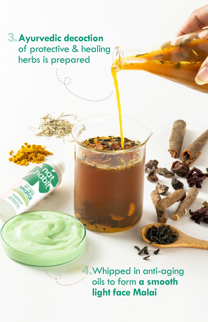 Massage well till the malai is fully absorbed into the skin, else the aloe part of the malai will give an unnecessary tightening on skin.