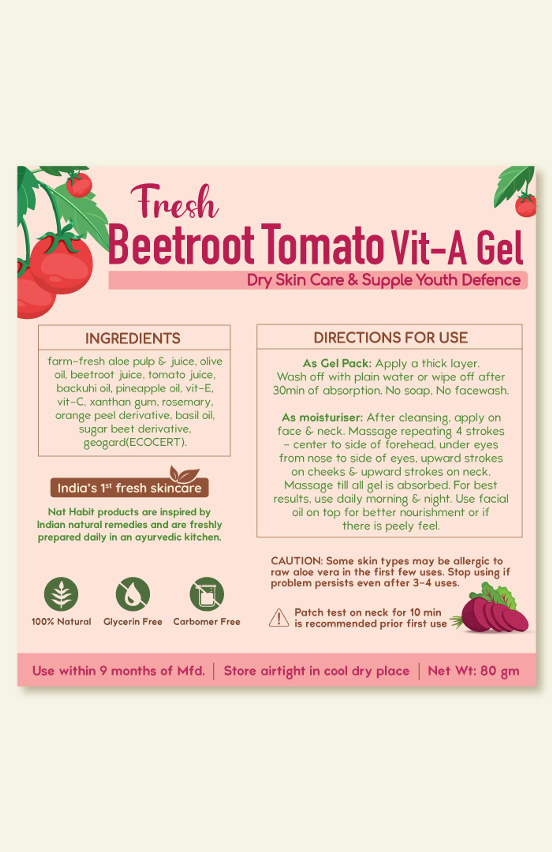 Full Ingredients List: farm-fresh aloe pulp & juice, olive oil, beetroot juice, tomato juice, bakuchi oil, pineapple oil, vit-E, vit-C, xanthan gum, rosemary, orange peel derivative, basil oil, sugar beet derivative, geogard (ecocert).