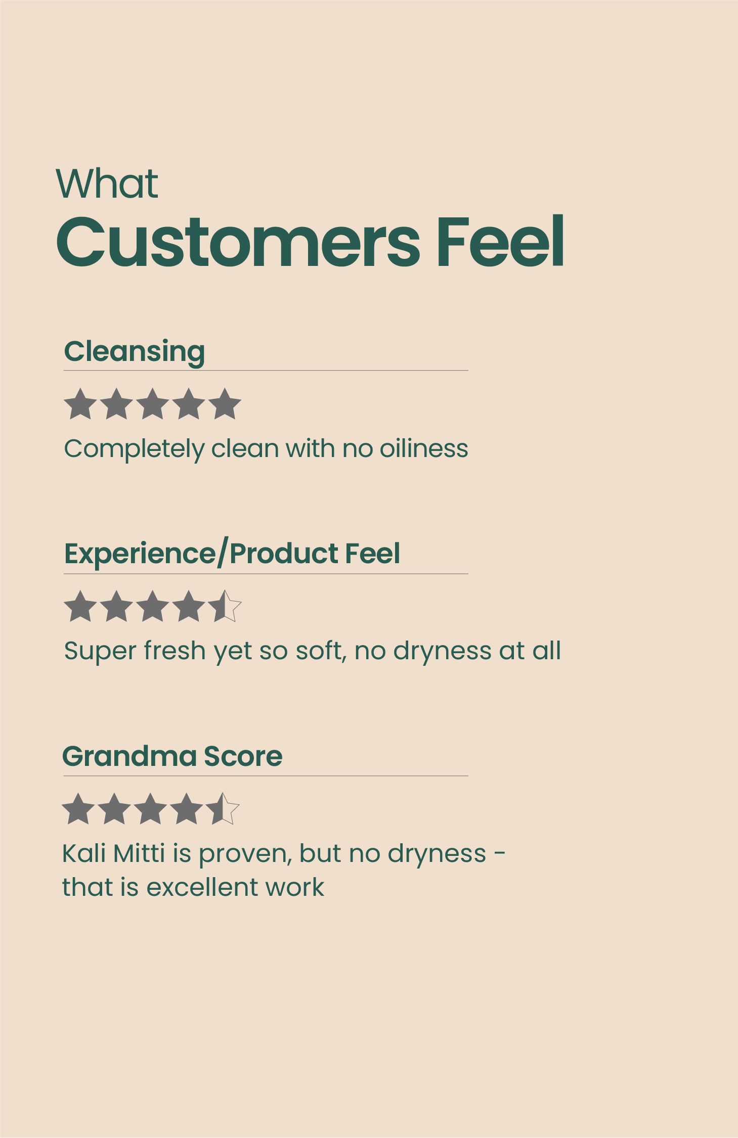 Rich kali mitti actives purifies deeply to reset bright clarity.