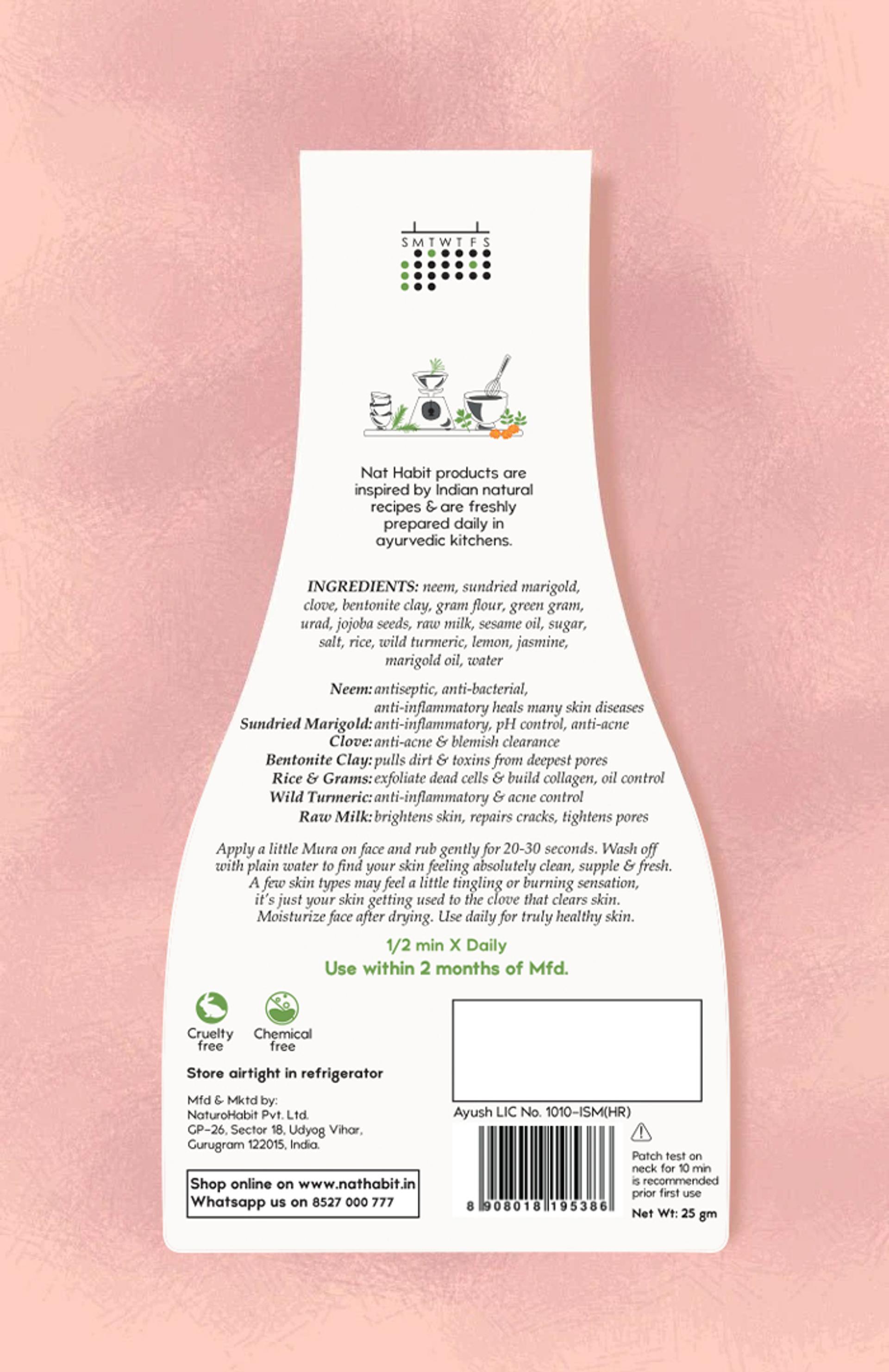 Full Ingredient List: neem, sundried marigold, clove, bentonite clay, gram flour, green gram, urad, jojoba seeds, raw milk, sesame oil, sugar, salt, rice, wild turmeric, lemon, jasmine, marigold oil, aqua.