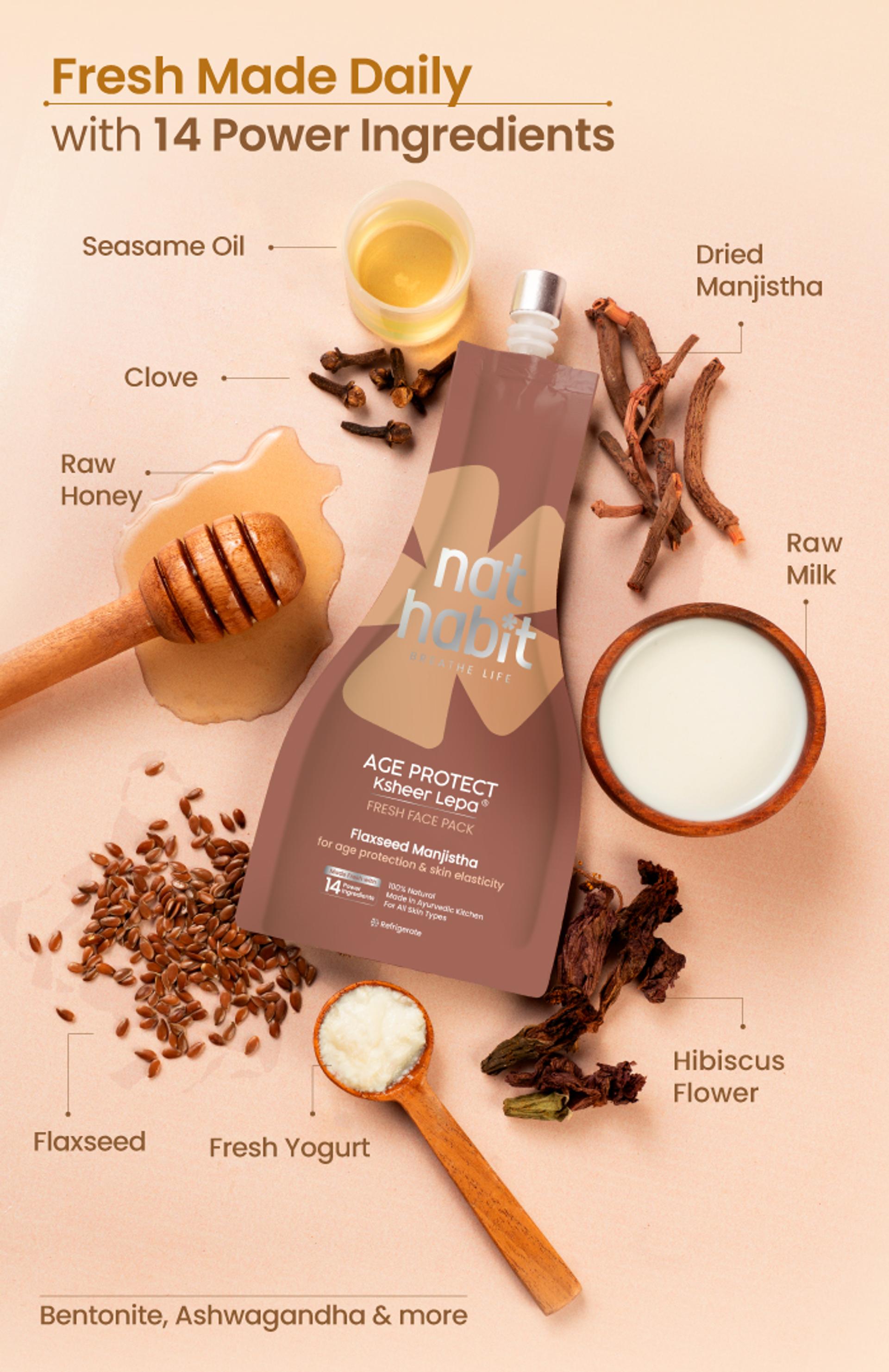 Full Ingredient List: flax seeds, manjistha, hibiscus flower, raw milk, yogurt, ashwagandha, lodhra, raw honey, sugar, salt, pineapple, clove, bentonite, besan & sesame oil.