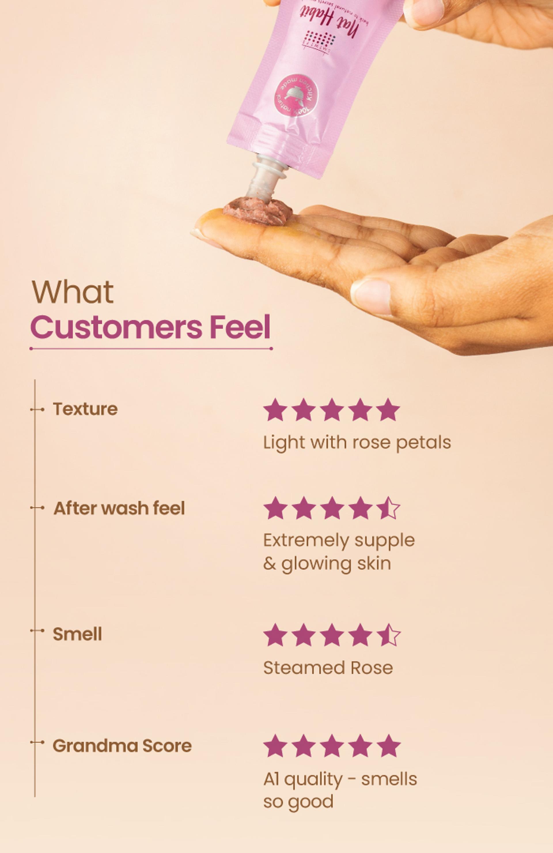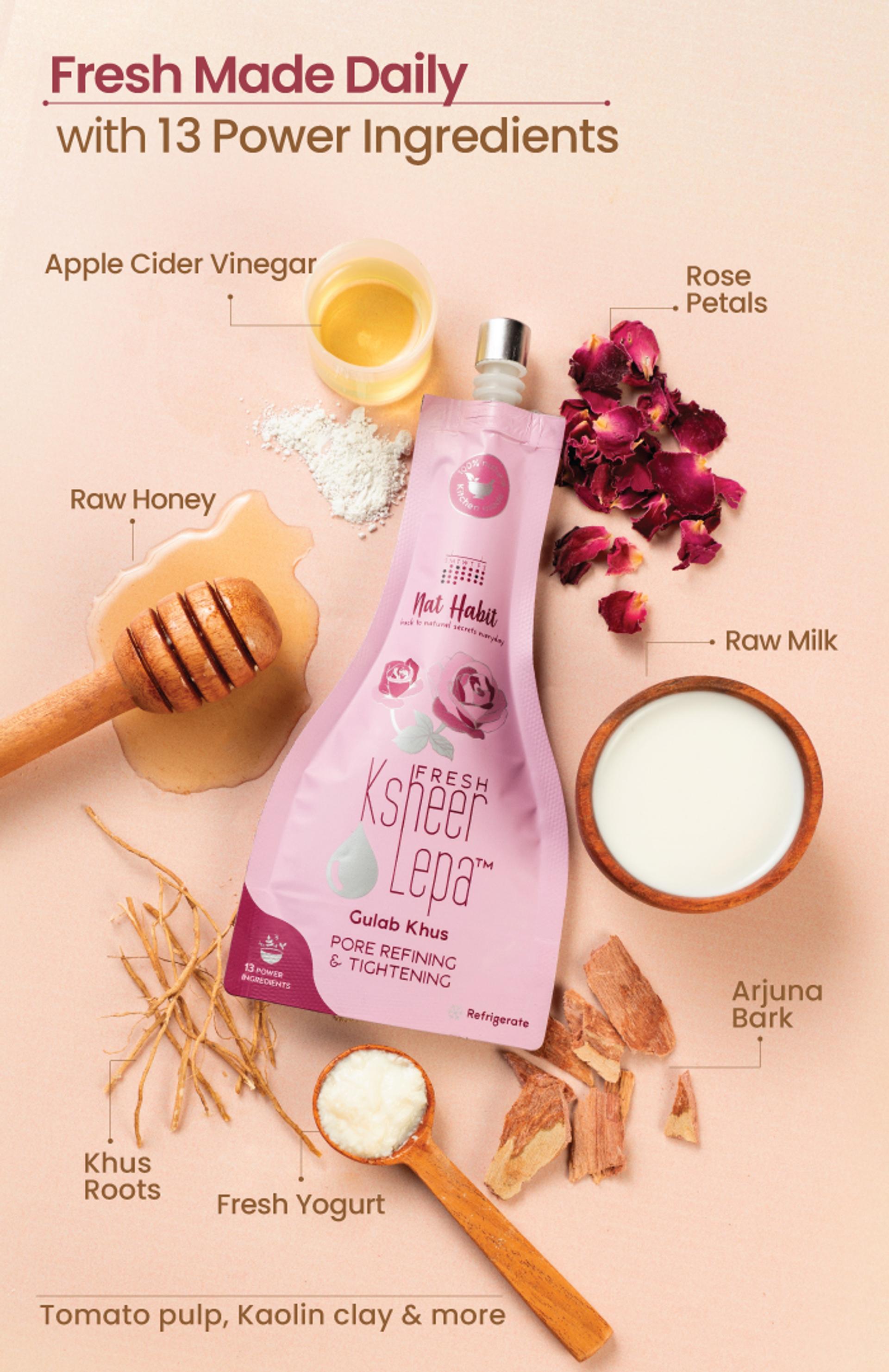 Full Ingredient List: rose, vetiver, tomato, arjuna bark, raw milk, yogurt, apple cider vinegar, kaolin clay, fine wheat, raw honey, sugar, salt, vanilla & sesame oil.