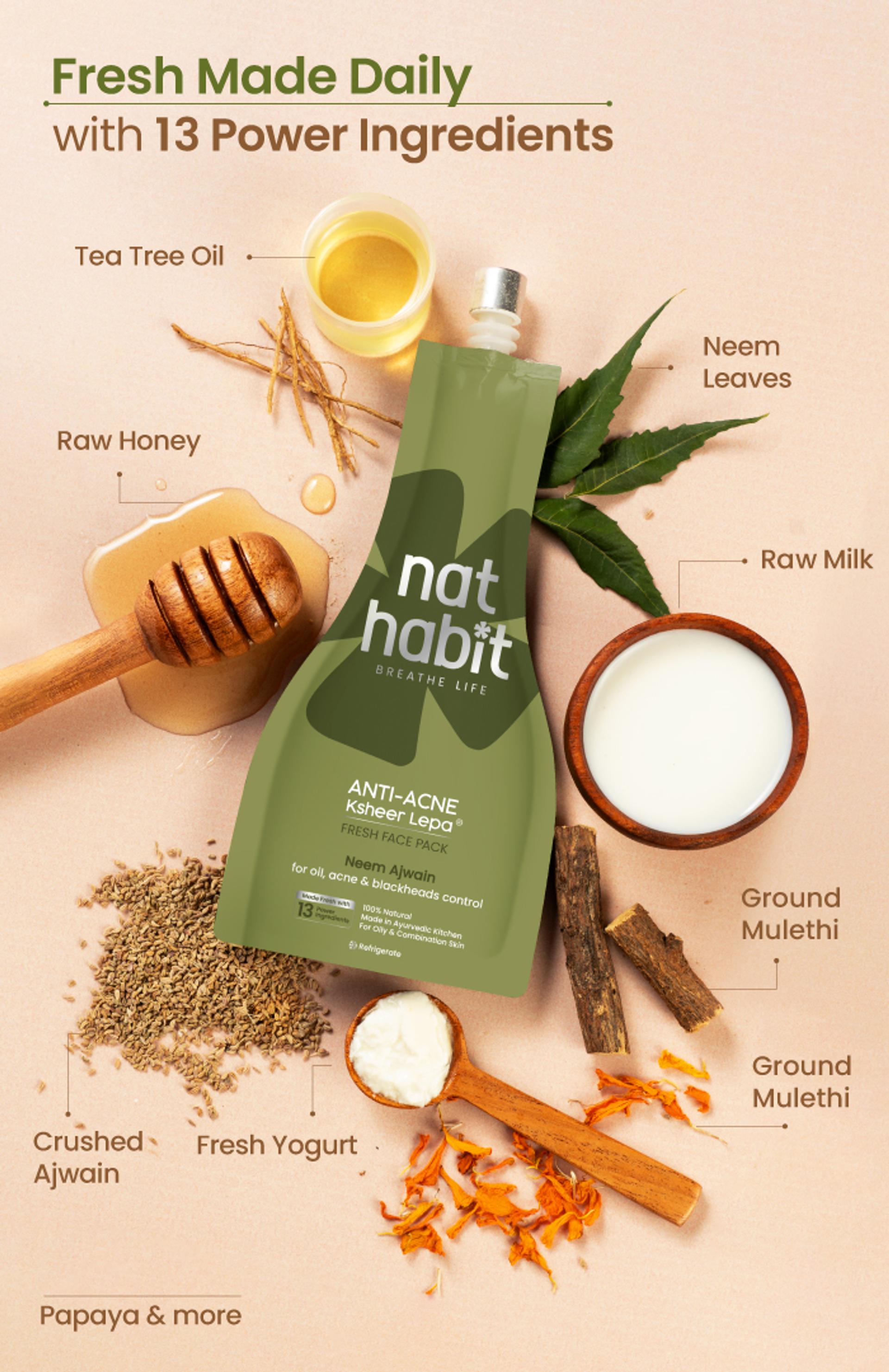 Full Ingredient List: neem, ajwain, tea tree, sun-dried marigold, raw milk, yogurt, mulethi, vetiver, raw honey, sugar, salt, bentonite, besan & sesame oil.