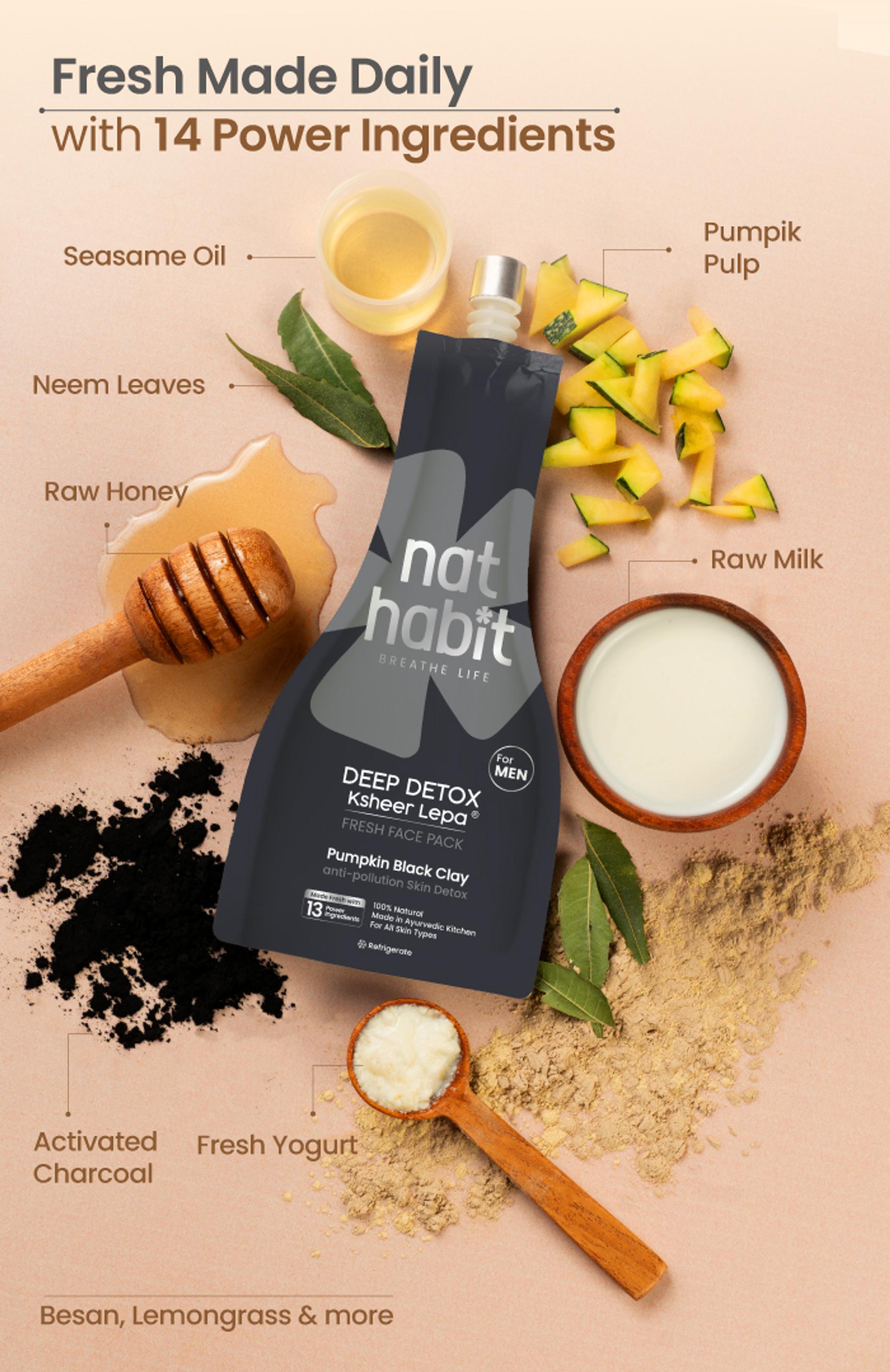 Full Ingredient List: pumpkin, activated charcoal, raw milk, yogurt, neem, pine, geranium, raw honey, sugar, salt, bentonite, besan, lemongrass & sesame oil.