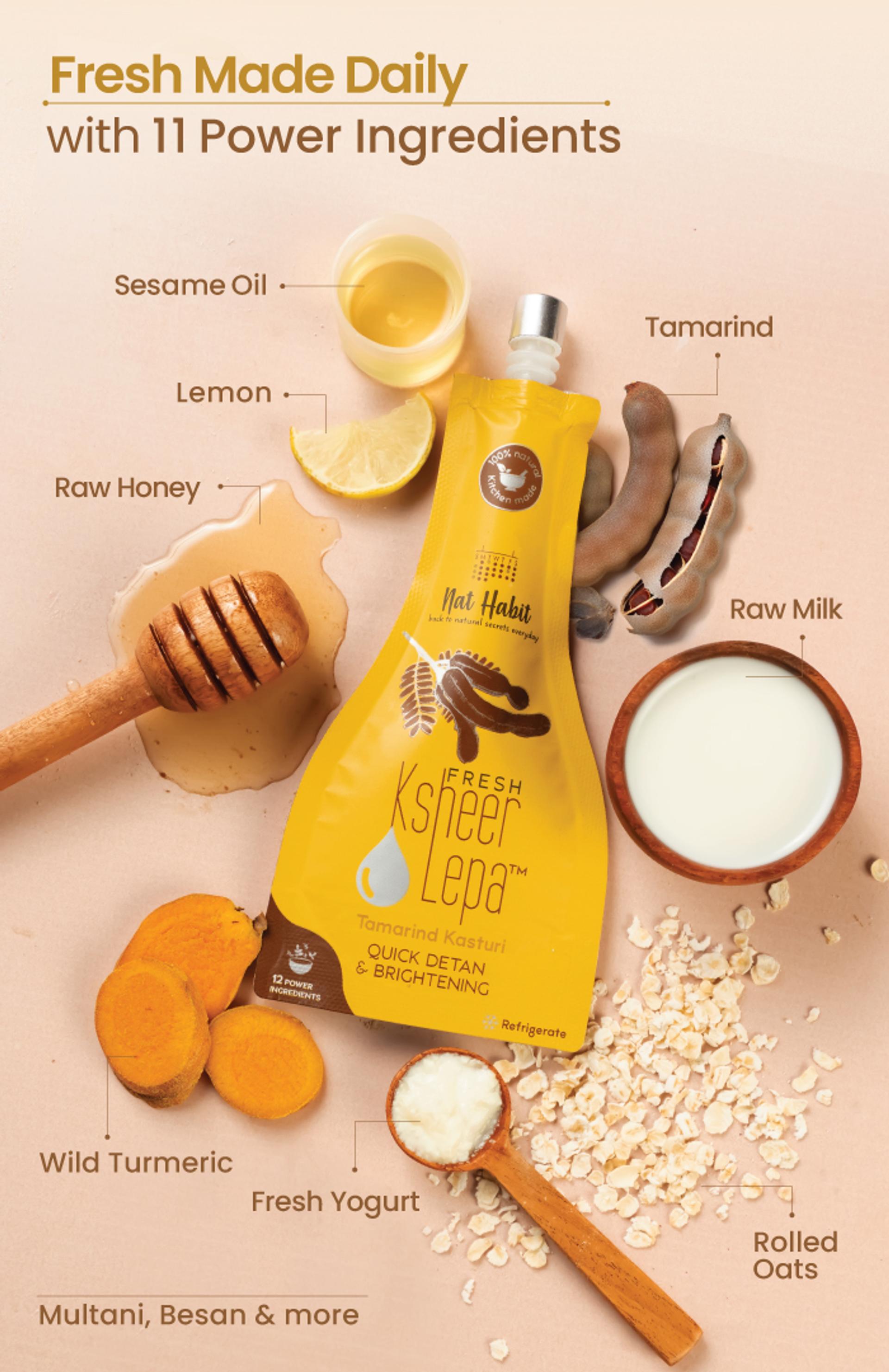 Full Ingredient List: tamarind, wild turmeric, yogurt, raw milk, oats, raw honey, lemon, multani, besan, sugar, salt & sesame oil.