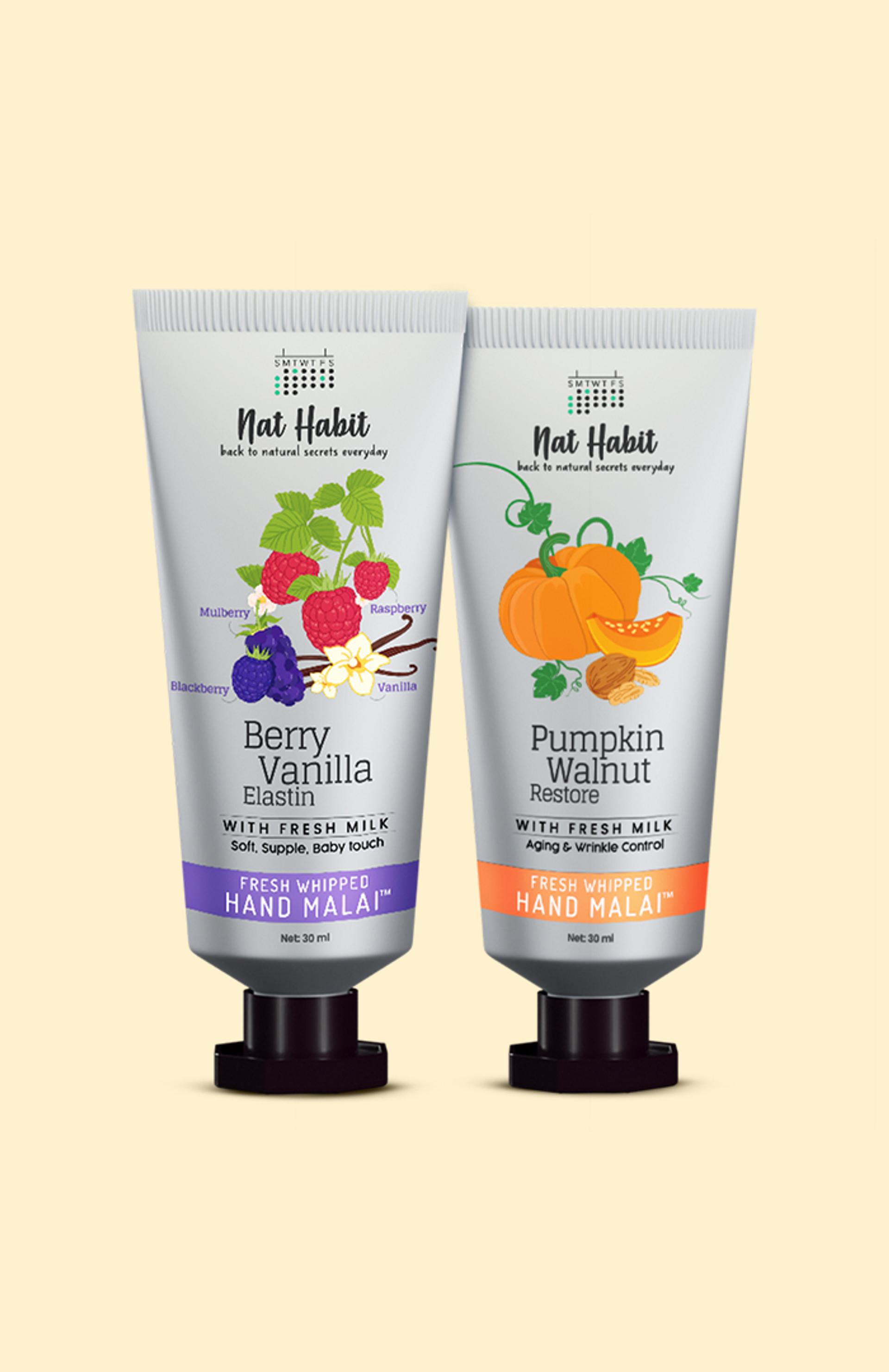 1 pack (30 ml) x Berry Vanilla Elastin Hand Malai 1 pack (30 ml) x Pumpkin Walnut Hand Malai