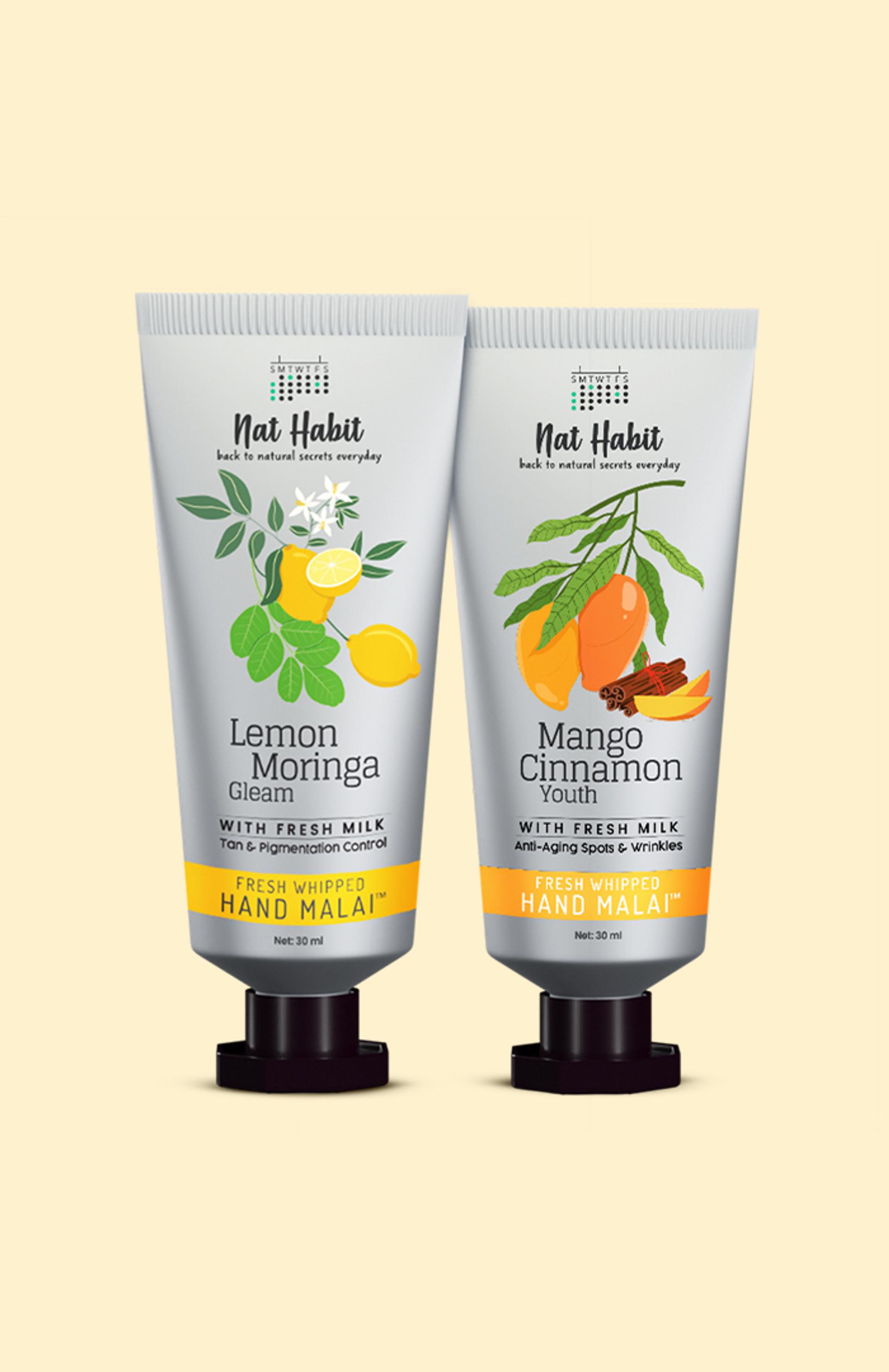 1 pack (30 ml) x Mango Cinnamon Hand Malai 1 pack (30 ml) x Lemon Moringa Hand Malai
