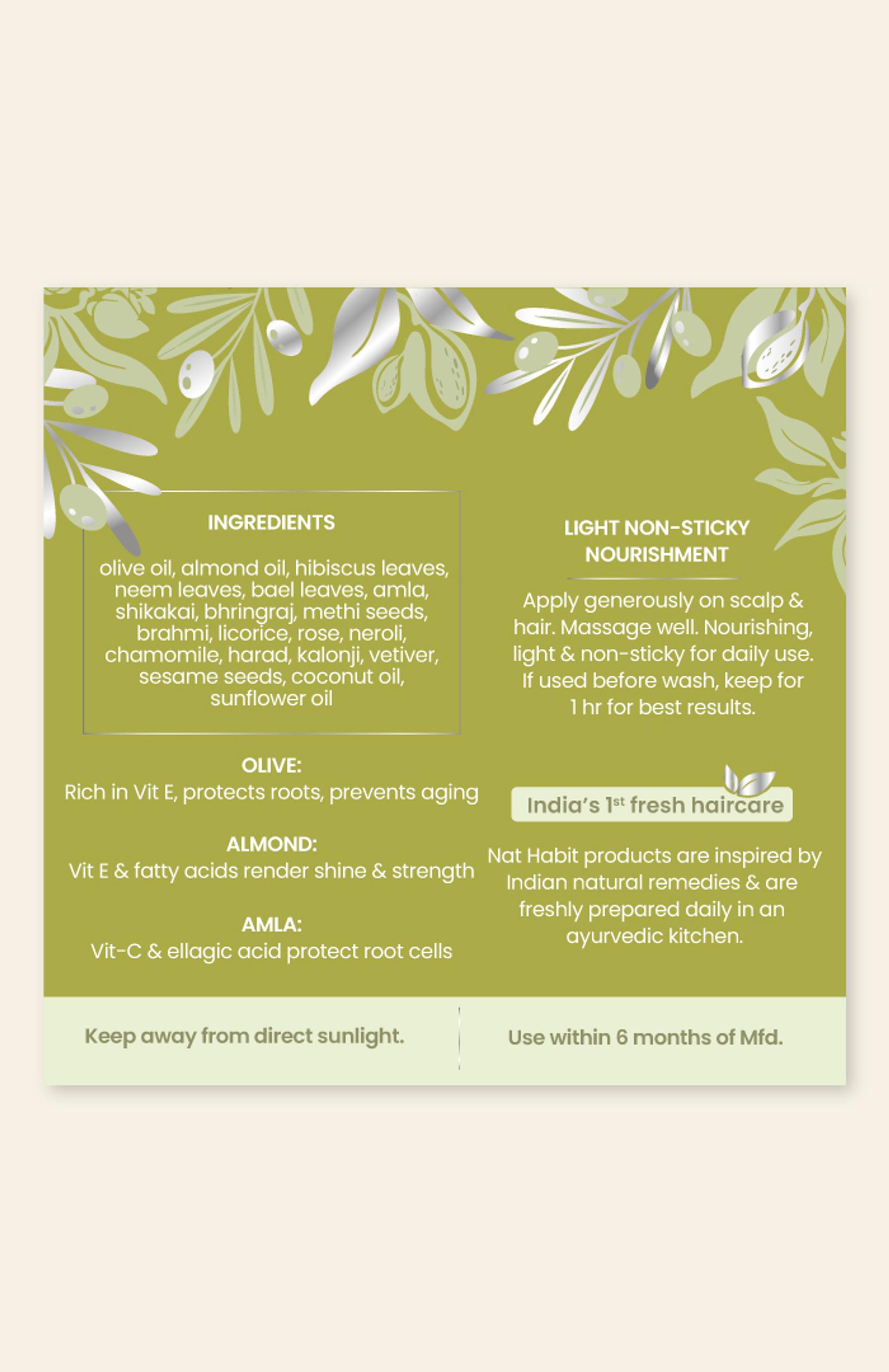 Full Ingredient List: olive oil, almond oil, hibiscus leaves, neem leaves, bael leaves, amla, shikakai, bhringraj, methi seeds, brahmi, licorice, rose, neroli, chamomile, harad, kalonji, vetiver, sesame seeds, coconut oil, sunflower oil
