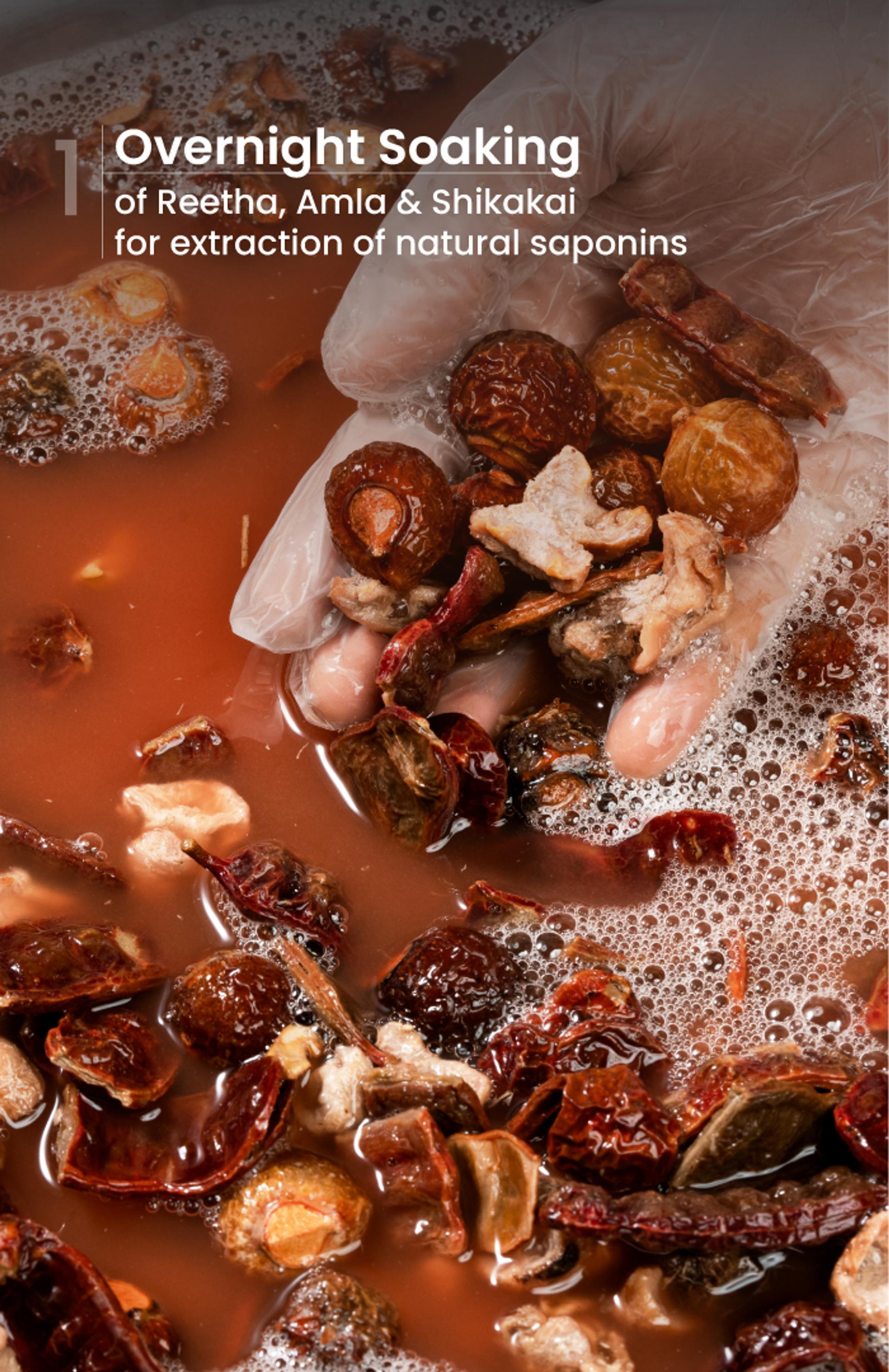 Naturally extracted saponins of reetha, shikakai, olive, coconut & more cleanses scalp without overdoing or effecting biome, hence, leaving a balanced, health-promotive environment for follicles & hair.