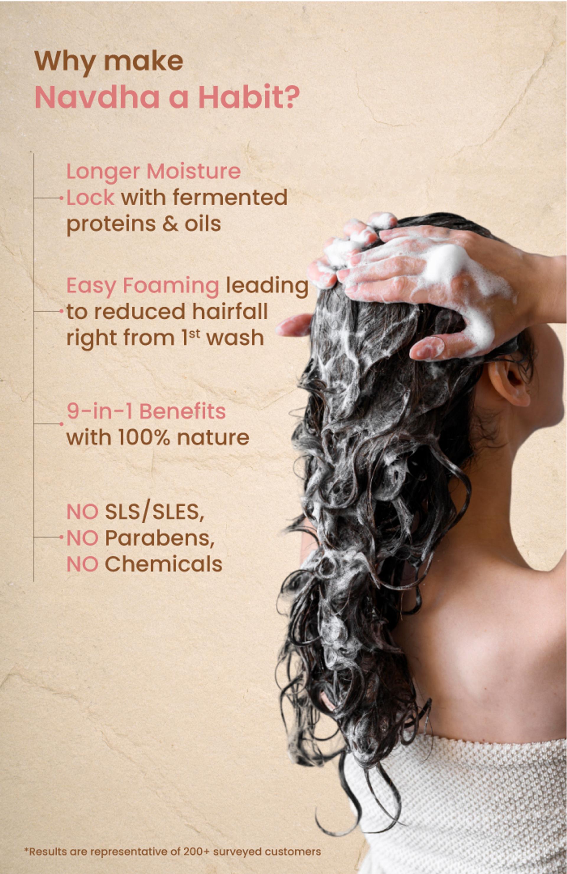 - Unlike regular shampoos, Navdha shampoo won’t give heavy foam or lather.