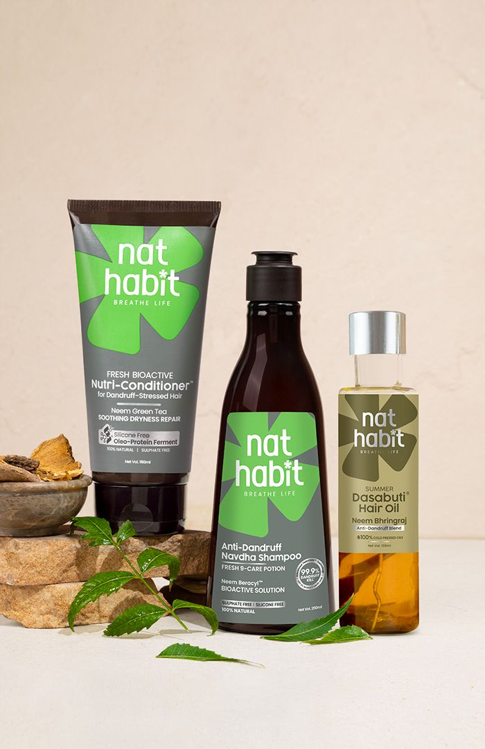 Dandruff-stressed hair needs targeted nourishment: Neem to support dandruff control, proteins to rebuild, and fatty acids to replenish.