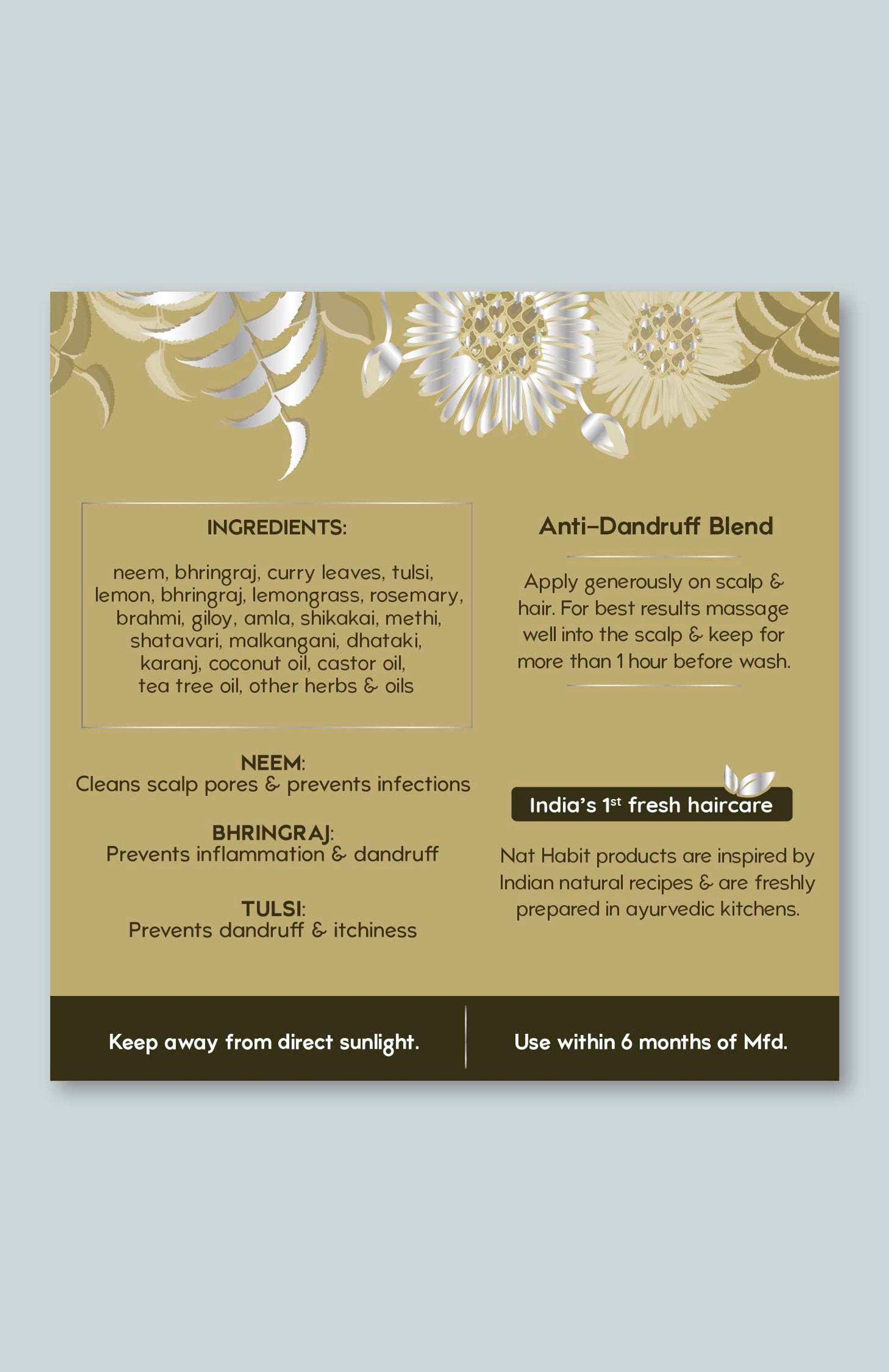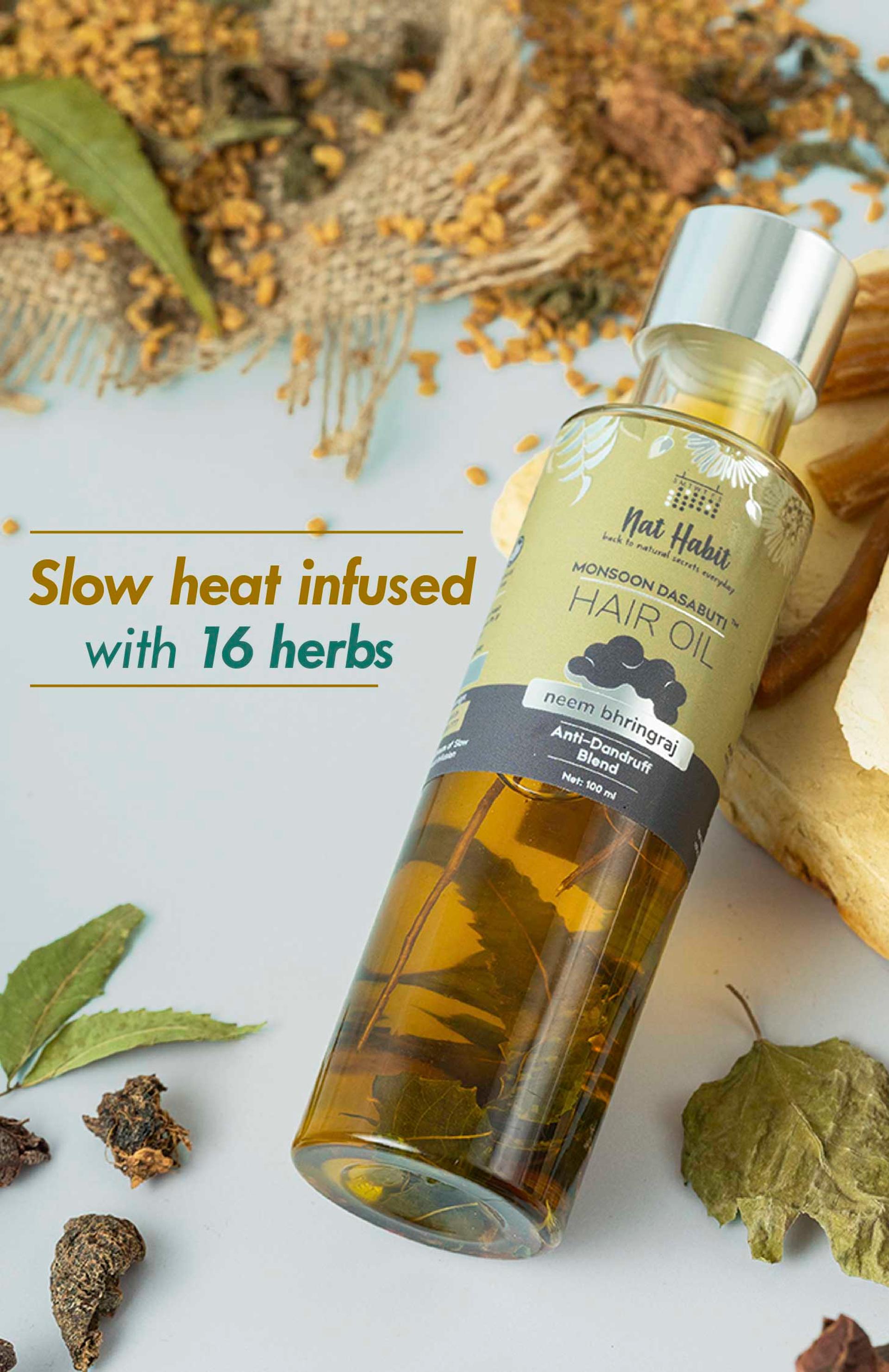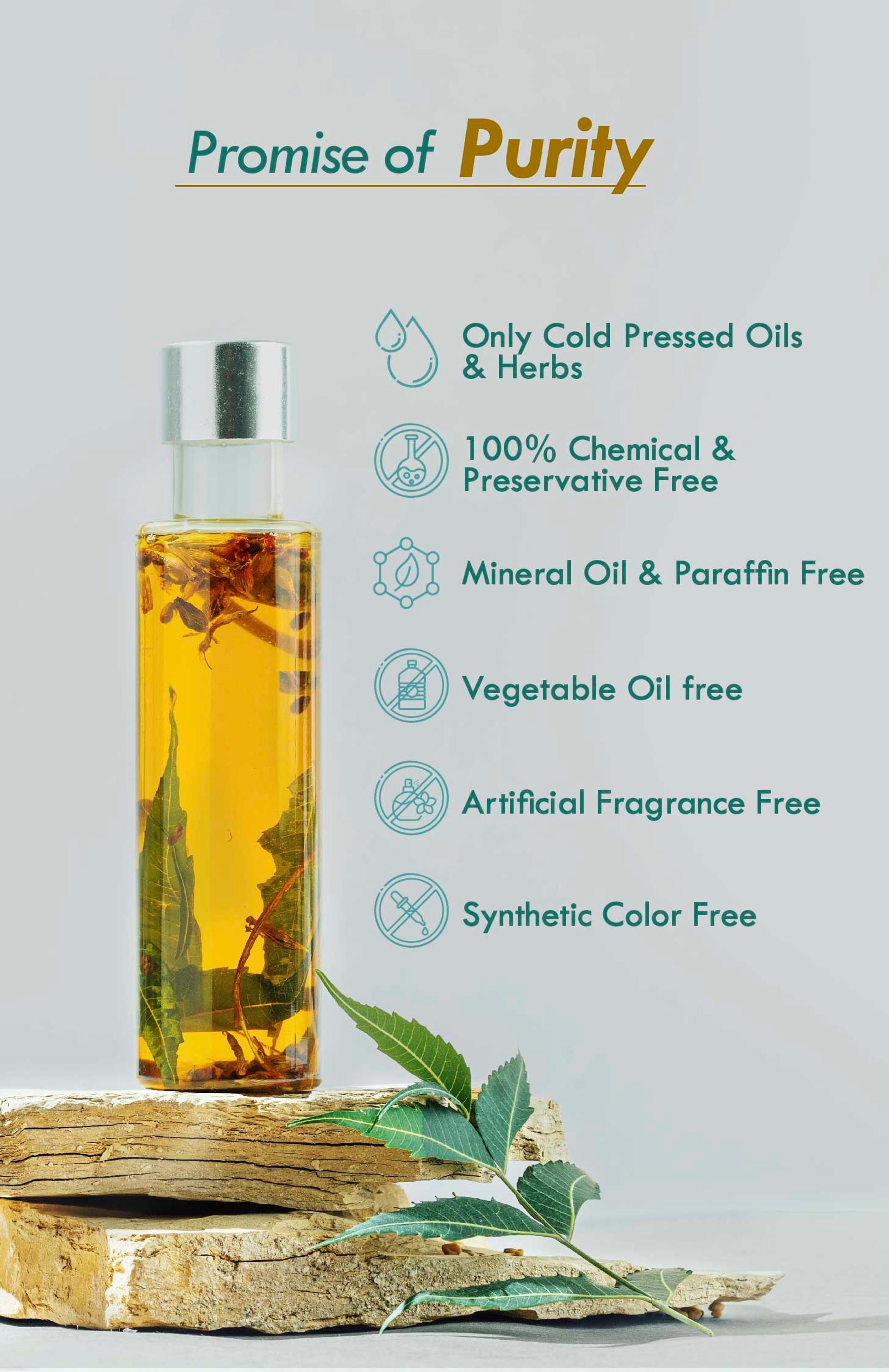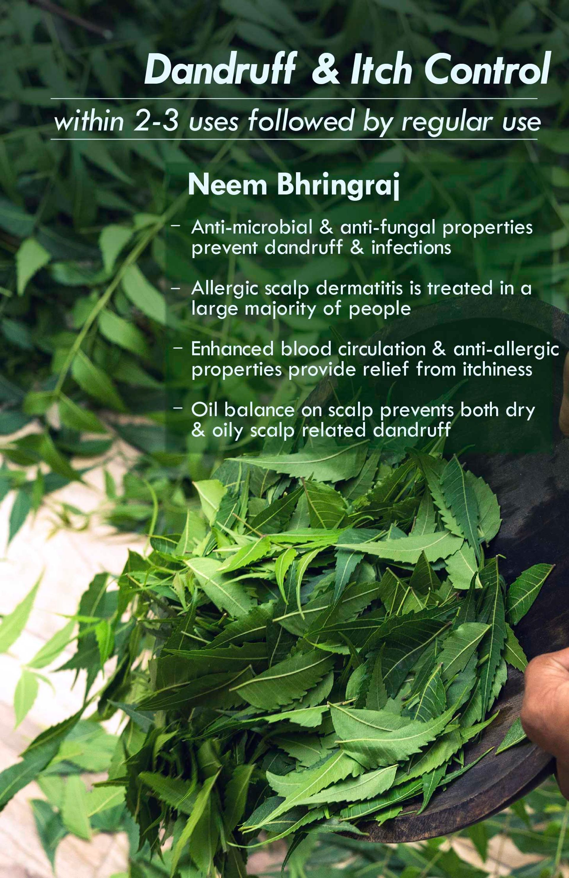 Full Ingredient List: neem, bhringraj, curry leaves, tulsi, lemon, lemongrass, rosemary, brahmi, giloy, amla, shikakai, methi, shatavari, malkangani, dhataki, karanj, ashwagandha, nagarmotha, kalonji, licorice, vetiver, coconut oil, castor oil, tea tree oil, mustard oil, neem oil