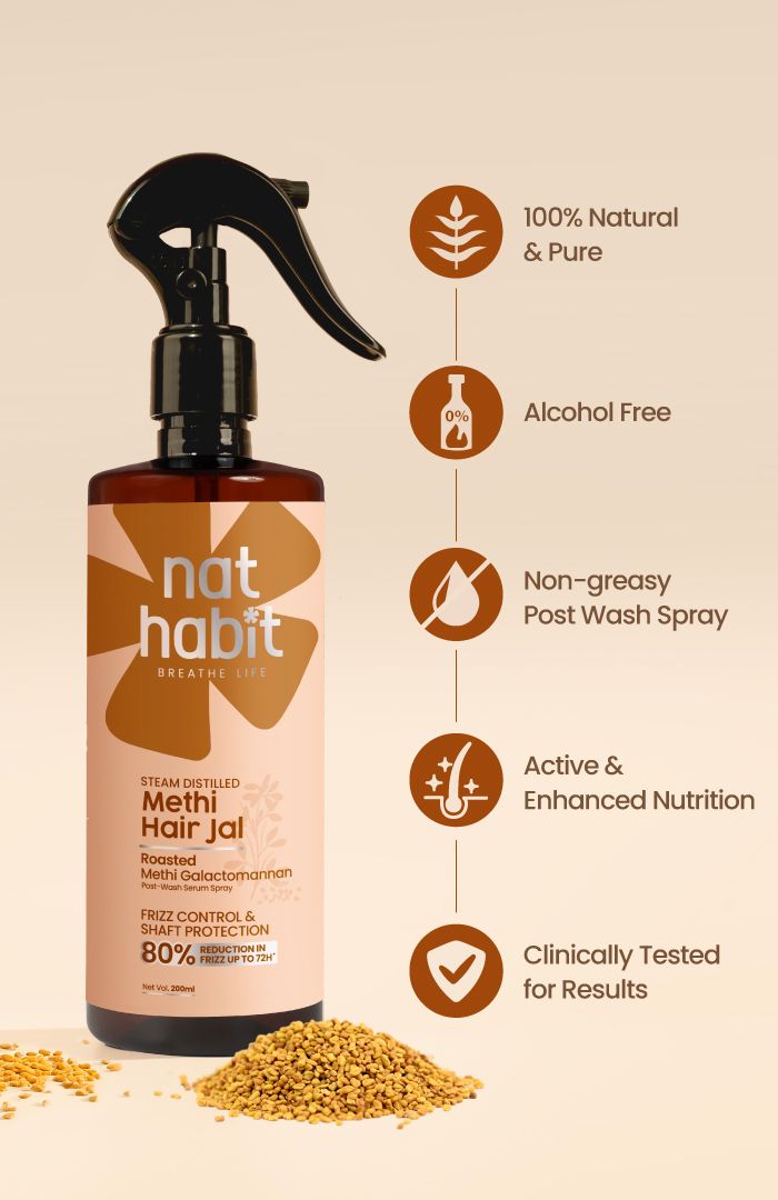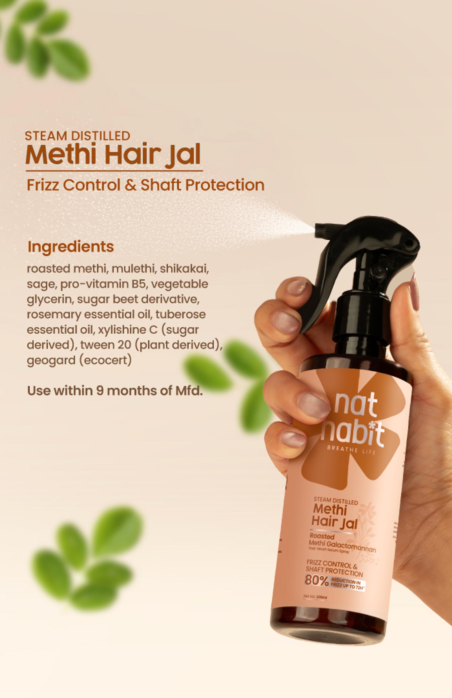 Rich in antioxidant amino acids & polyphenols, methi protects keratin fibres from oxidative reactions caused by pollution, UV exposure, and heat that weaken protein bonds and make hair brittle. It also improves internal moisture, restores the hair’s elasticity and increases tensile strength, reducing breakage.
