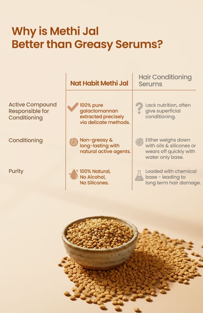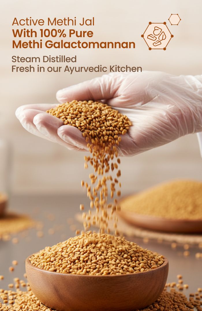 Methi’s galactomannans bind water molecules and create a thin, non-sticky hydrating film that keeps the surface uniformly moisturised without weighing it down. It also neutralises excess negative surface charge on the cuticle, keeping the cuticle plates lying flat, sealed, and smooth, preventing moisture escape and humidity-induced swelling.