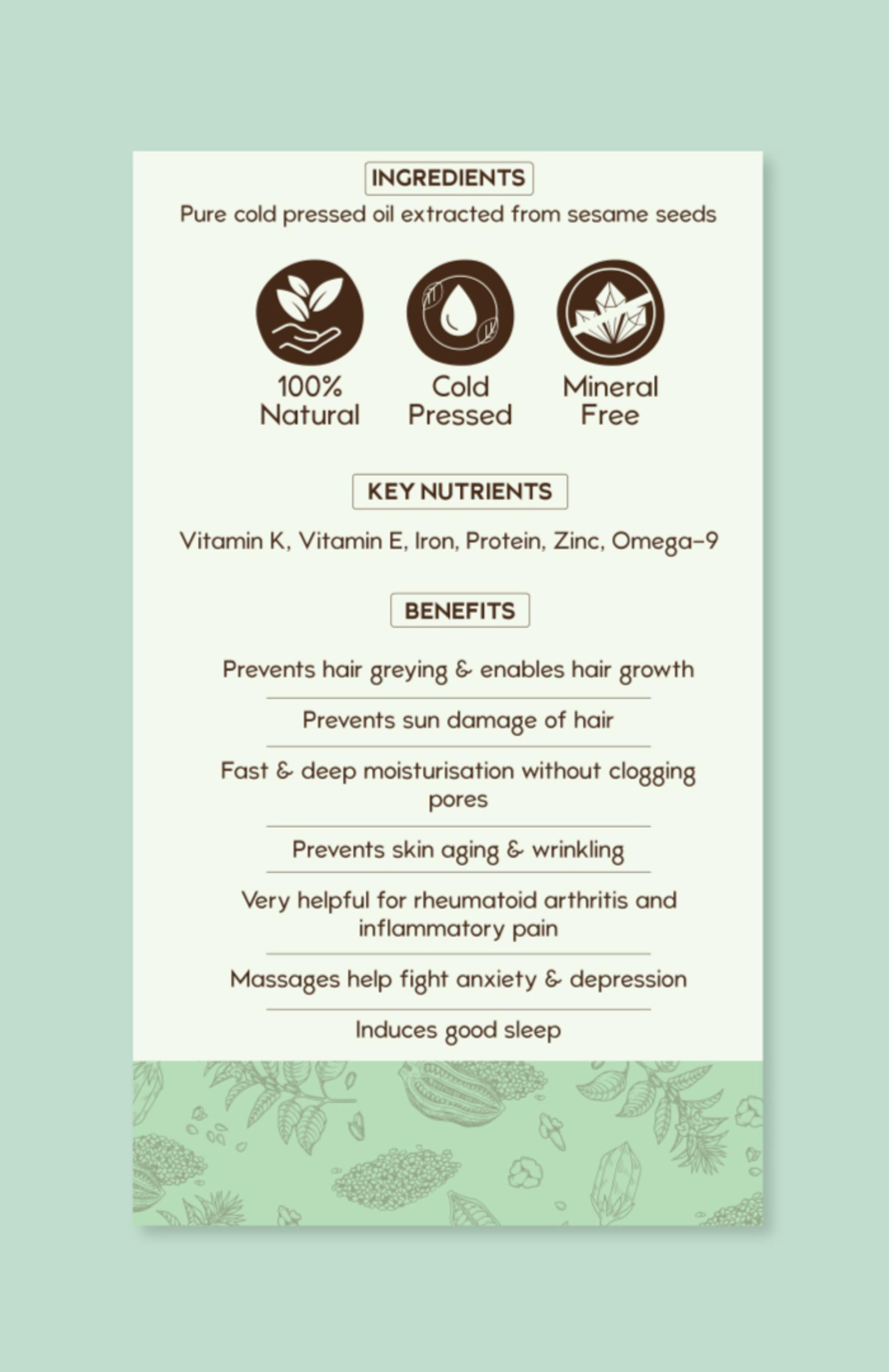 Unlike heavier oils, cold-pressed sesame oil absorbs quickly into the skin, delivering intense hydration without blocking pores. Its linoleic acid content allows it to penetrate deep, leaving skin plump, supple, and moisturised, perfect for daily use, even on oily or combination skin types.