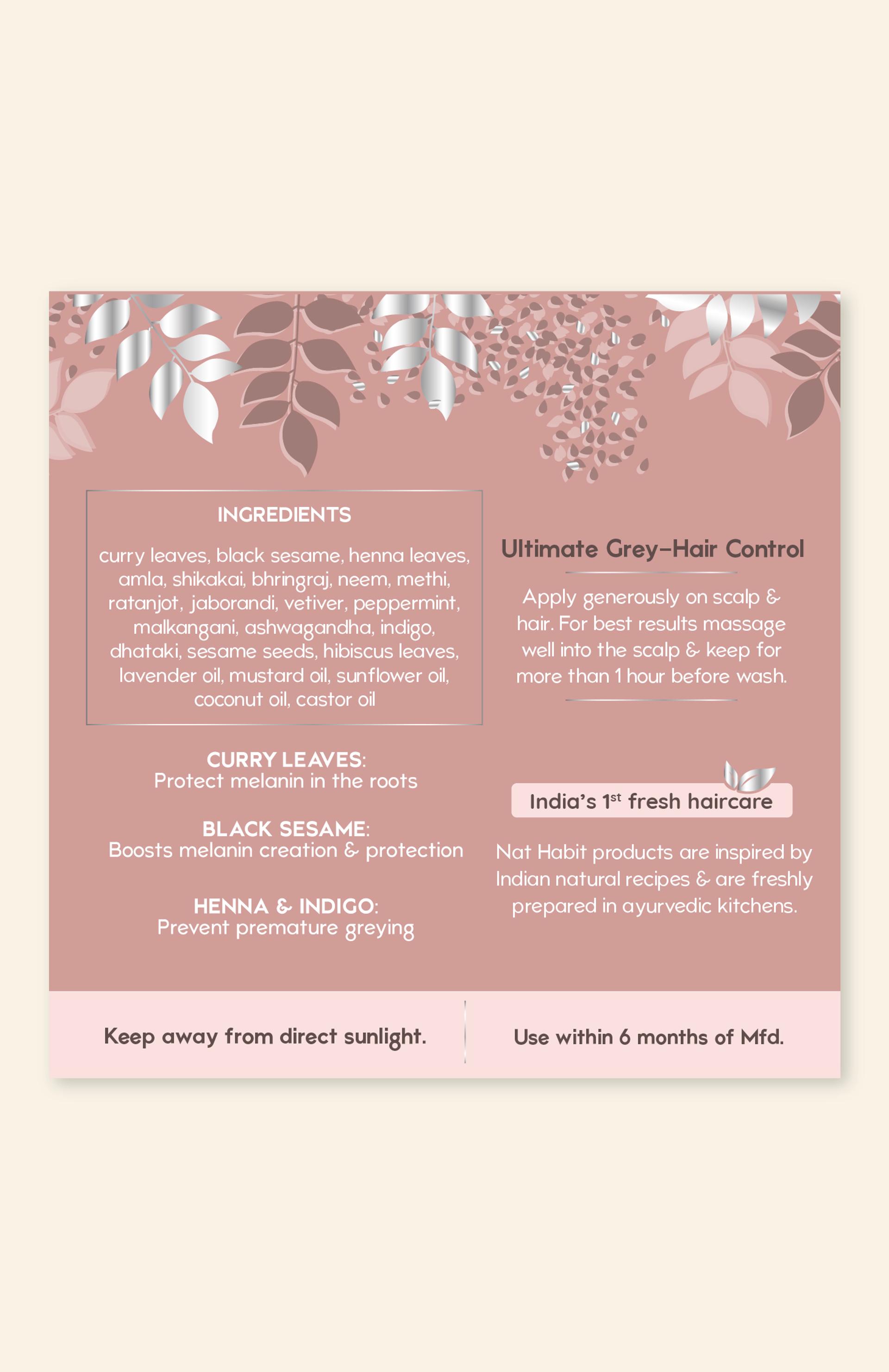 Full Ingredient List: curry leaves, black sesame, henna leaves, amla, shikakai, bhringraj, neem, methi, ratanjot, jaborandi, vetiver, peppermint, malkangani, ashwagandha, indigo, dhataki, sesame seeds, hibiscus leaves, lavender oil, mustard oil, sunflower oil, coconut oil, castor oil