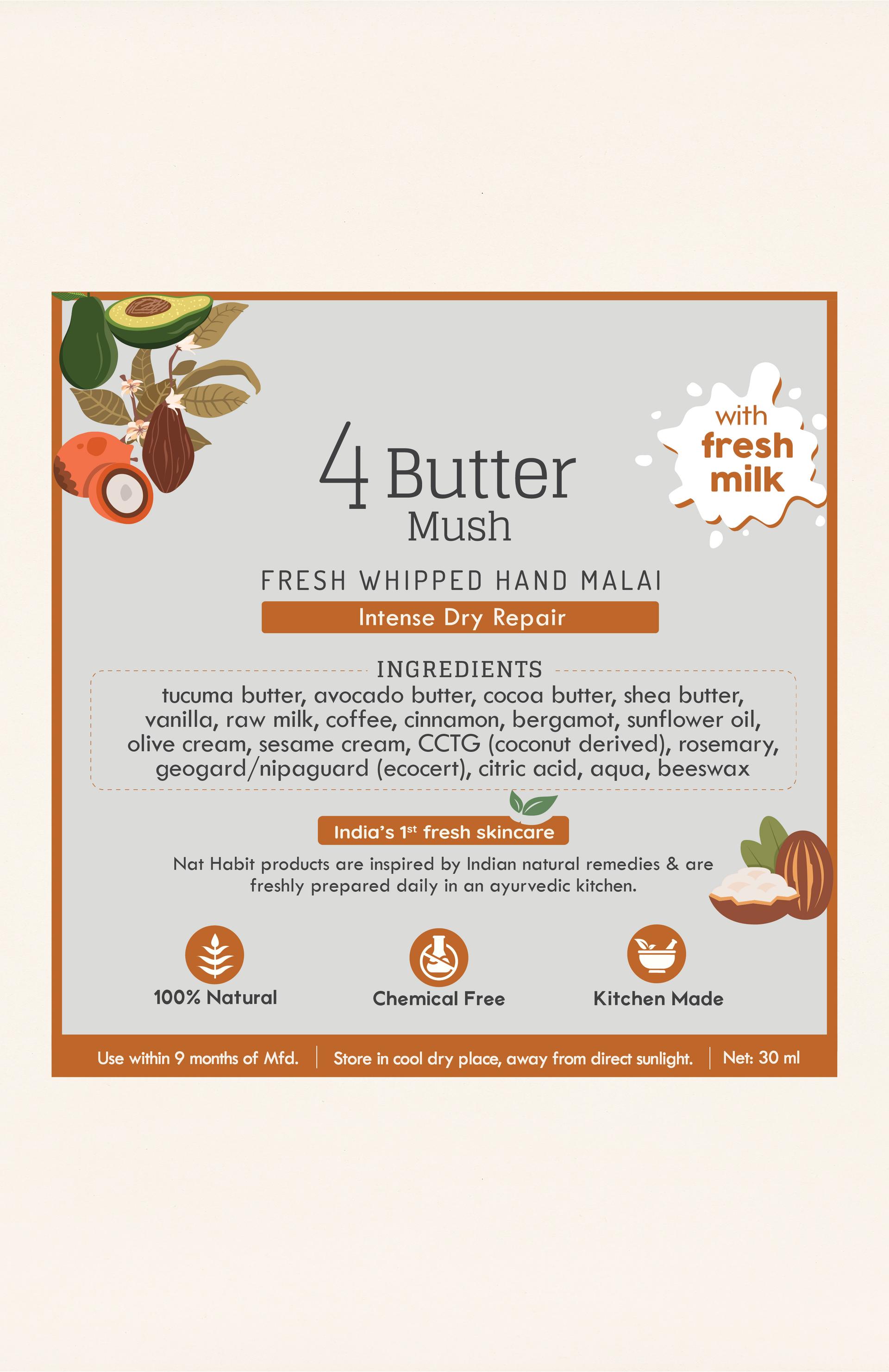 Proteins, fatty acids, & vit-E boost from milk & butters moisturise, enhance hydra retention and promote structural lipids.