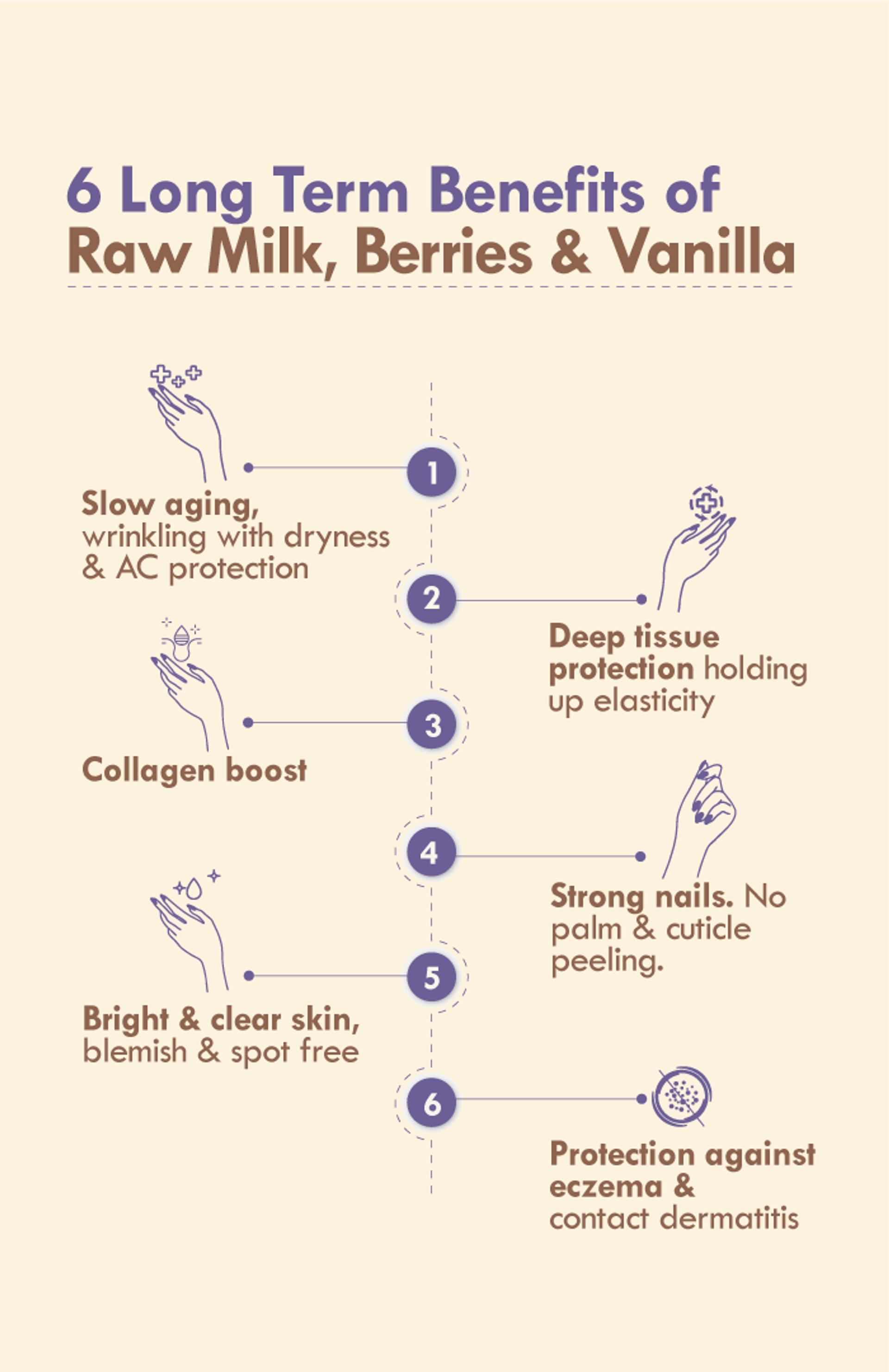 Proteins, fatty acids, & vit-E boost from milk & butters moisturise, enhance hydra retention and promote structural lipids.