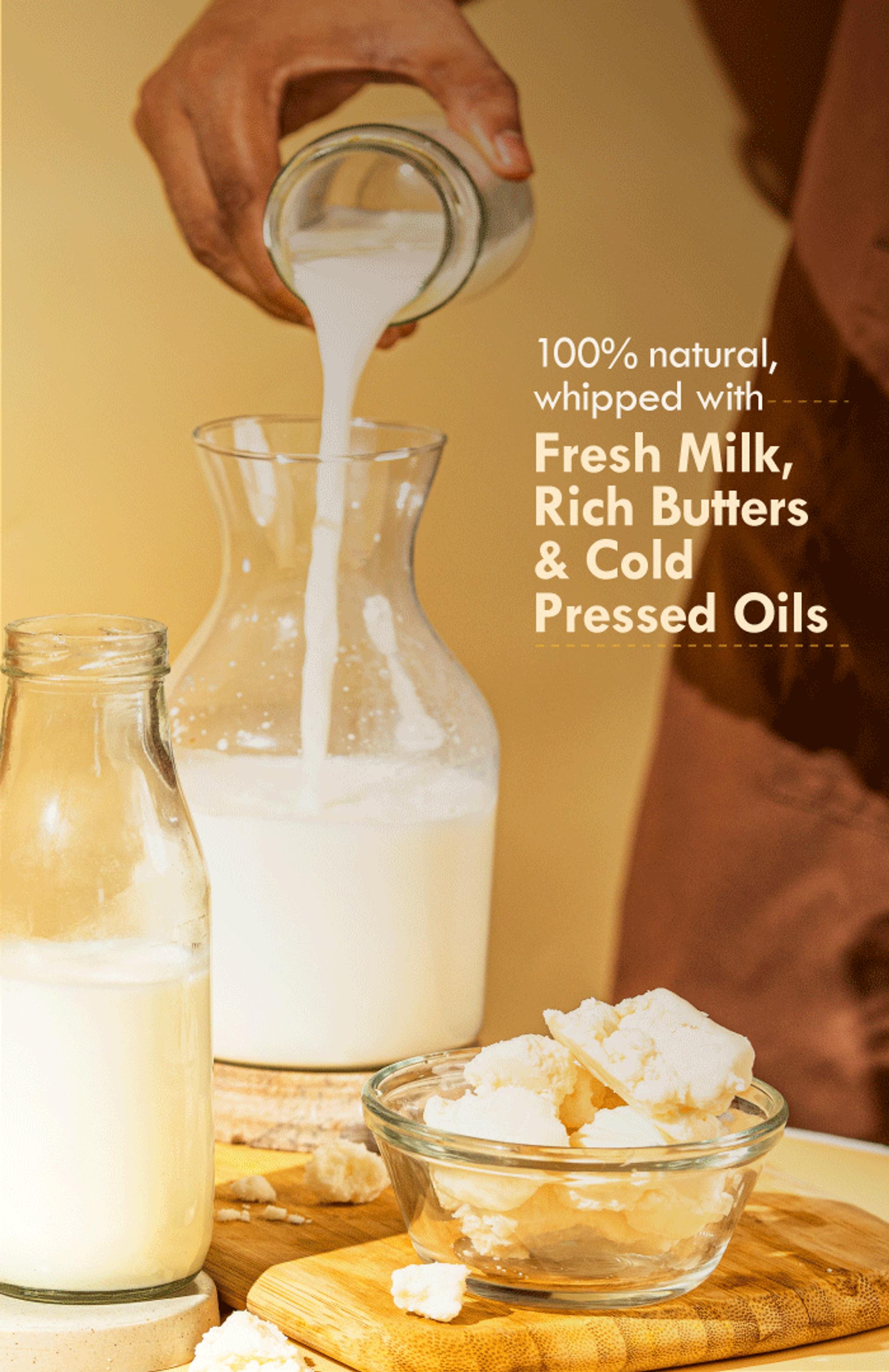 Proteins, fatty acids, & vit-E boost from milk & butters moisturise, enhance hydra retention and promote structural lipids.