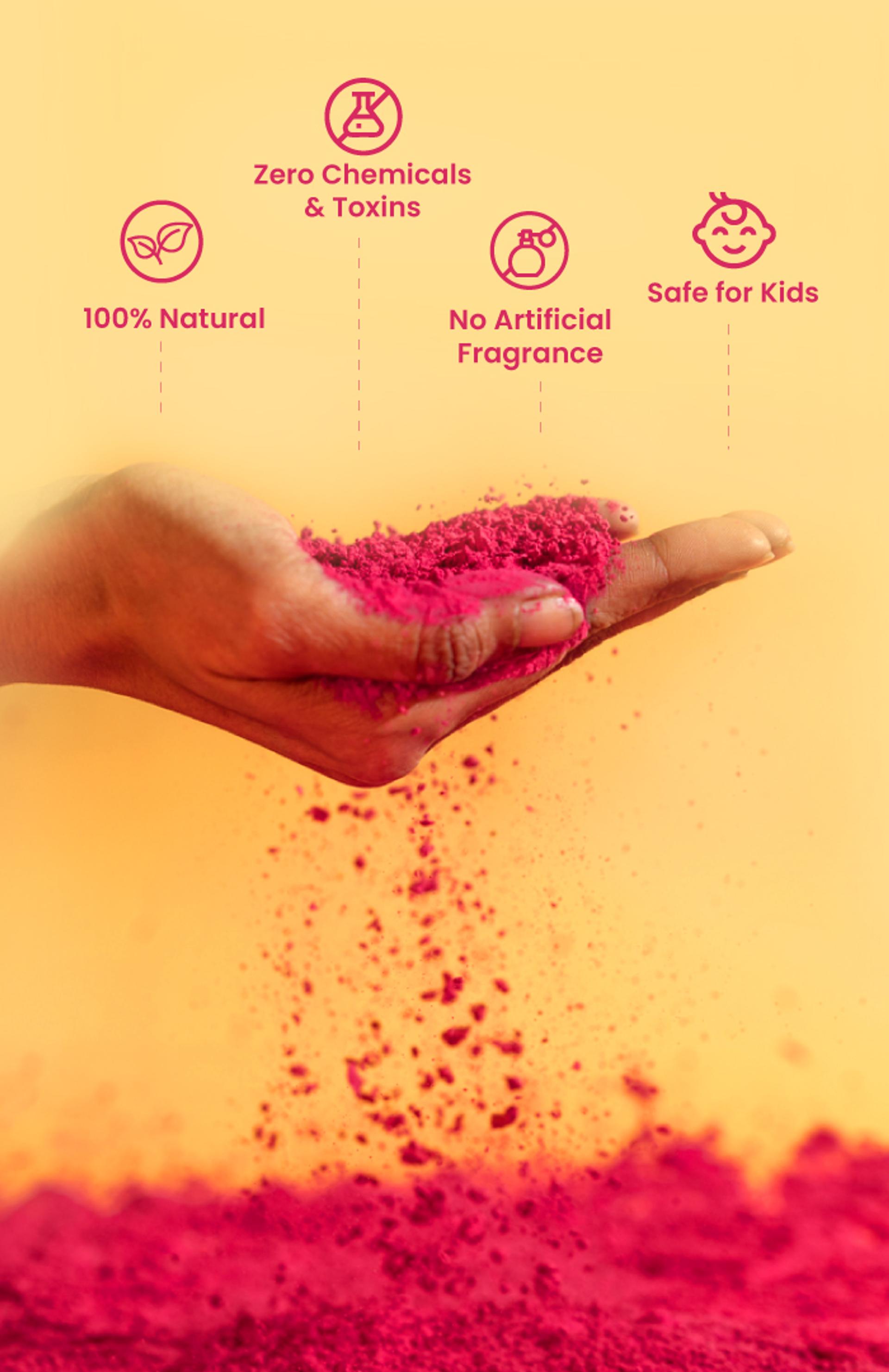 100% natural, handmade, vibrant GULAAL made of amaranth, beetroot & rose flowers. Absolutely no chemicals or toxins. Completely safe even for kids. Let the Holi Raas begin! 🌈