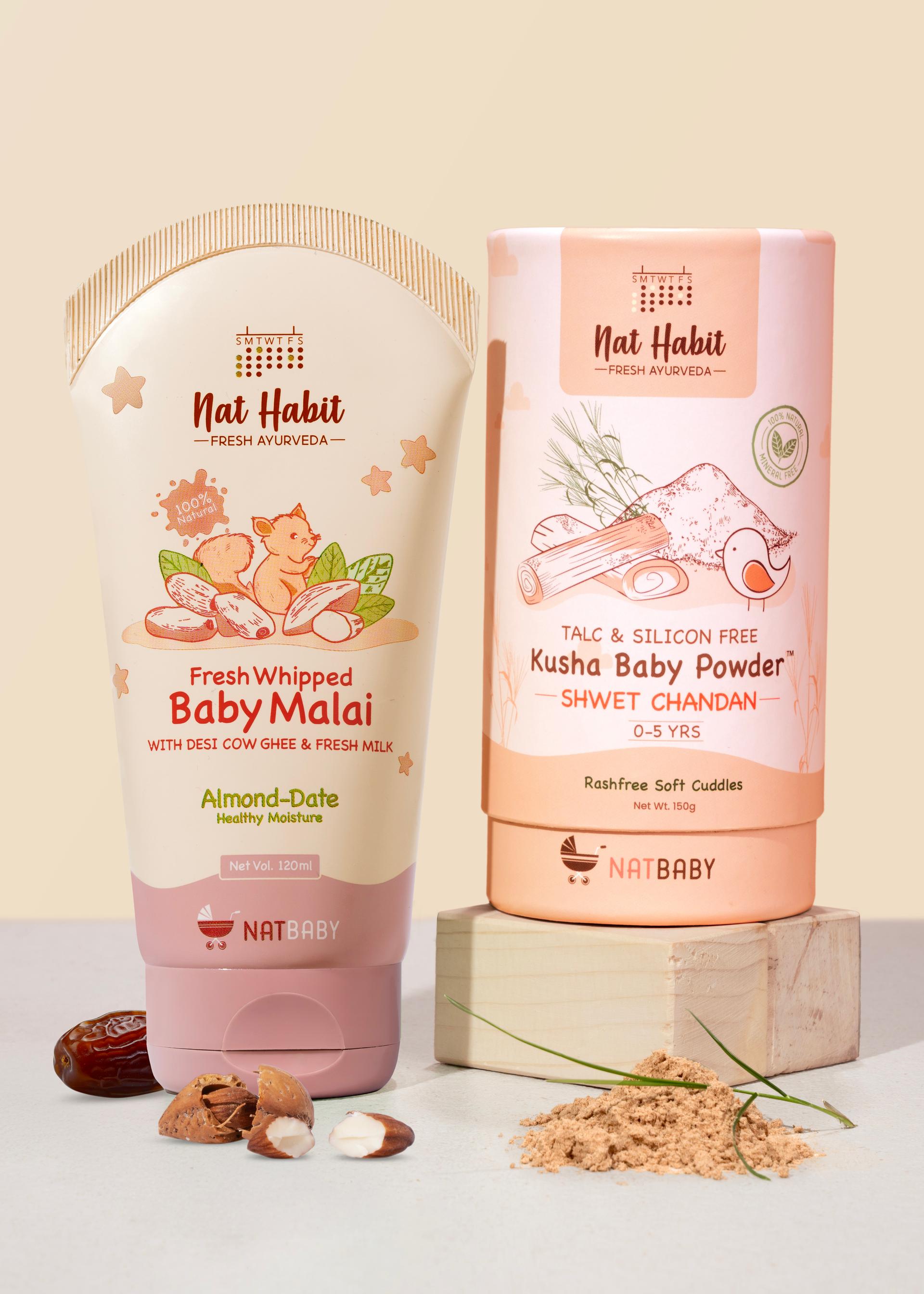 A duo crafted for all-day baby comfort. The Baby Malai, freshly made with raw milk, almond milk, dates, and ghee, deeply nourishes and hydrates delicate skin while helping regulate body temperature. Paired with our Ayurvedic Baby Powder, made with sweat-absorbing grains and anti-microbial herbs like wild turmeric and kusha to keep skin dry, soft, and rash-free. 100% Natural. No talc. No toxins. Just pure, breathable care.