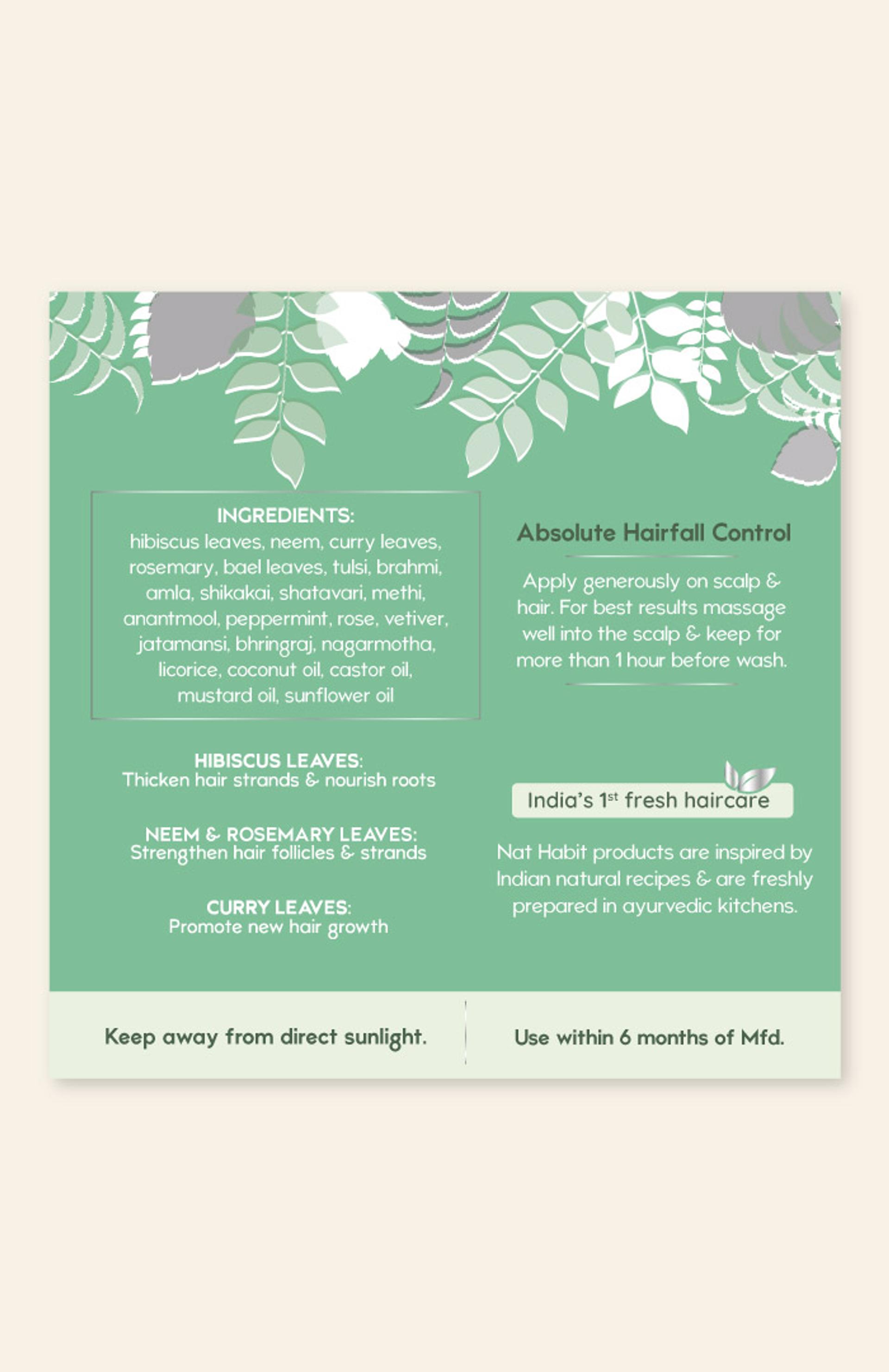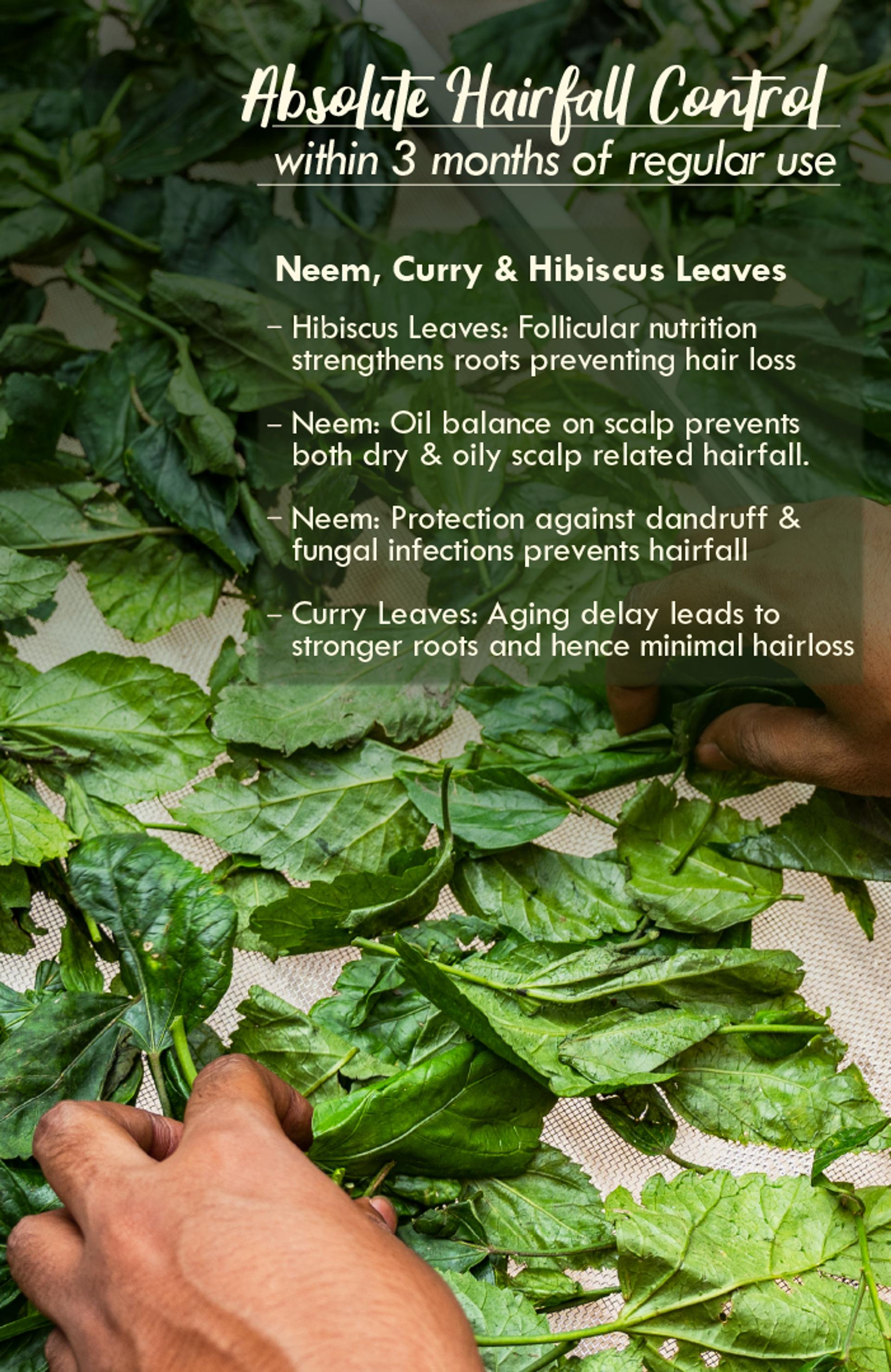 Full Ingredient List: hibiscus leaves, neem, curry leaves, rosemary, bael leaves, tulsi, brahmi, amla, shikakai, shatavari, methi, anantmool, peppermint, rose, vetiver, jatamansi, bhringraj, nagarmotha, licorice, coconut oil, castor oil, mustard oil, sunflower oil