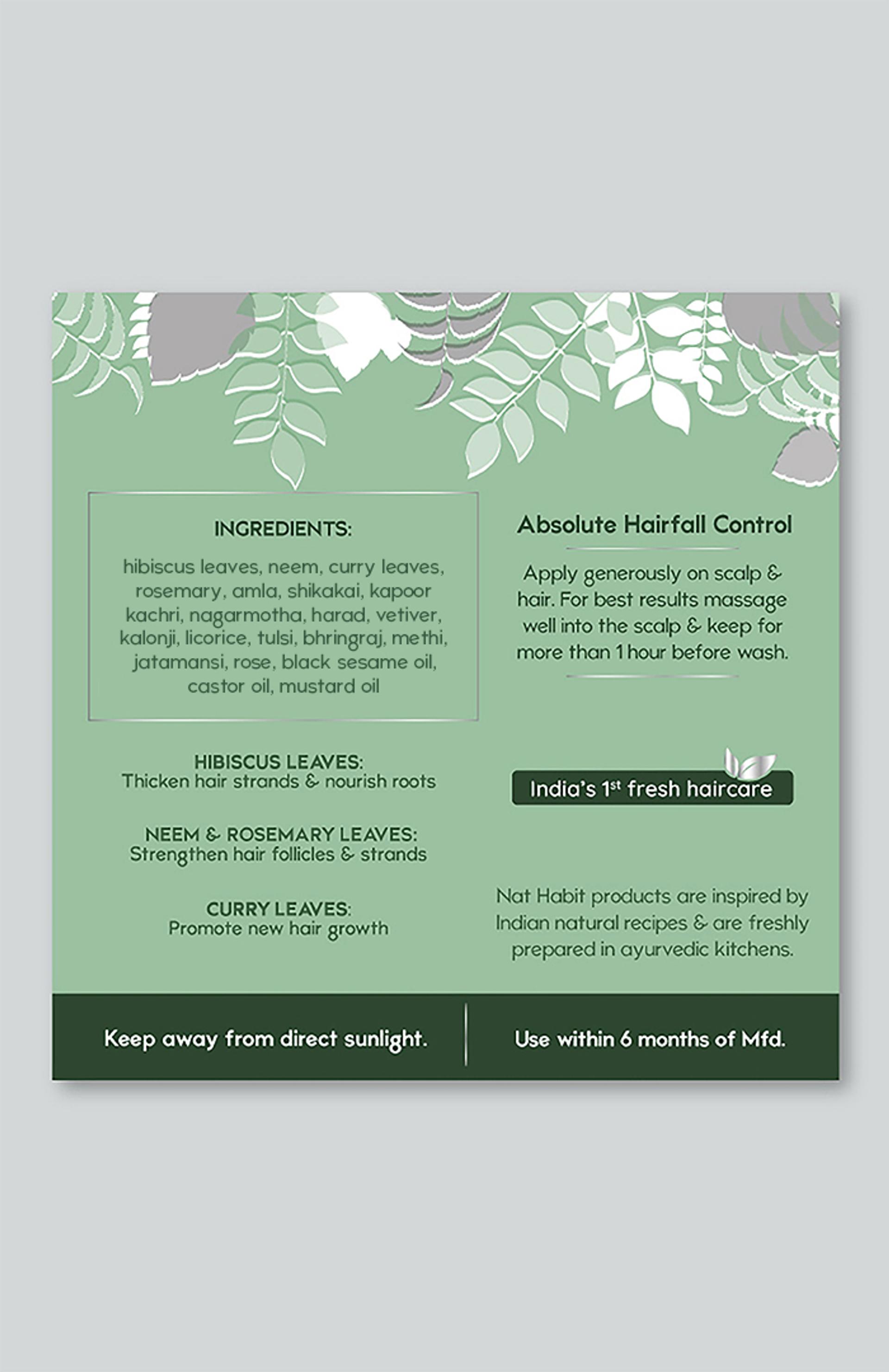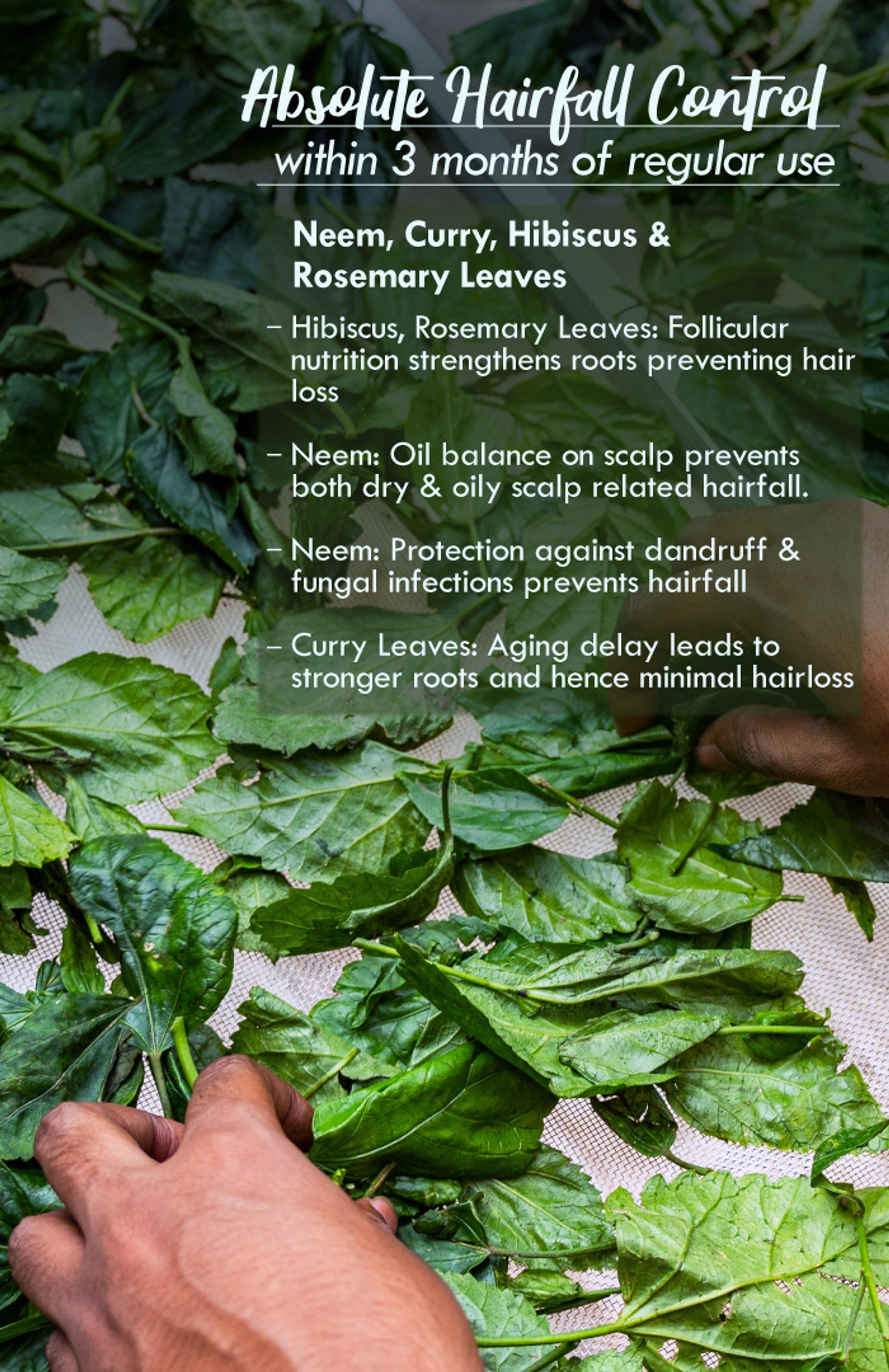 Full Ingredient List: hibiscus leaves, neem, curry leaves, rosemary, amla, shikakai, kapoor kachri, nagarmotha, harad, vetiver, kalonji, licorice, tulsi, bhringraj, methi, jatamansi, rose, black sesame oil, castor oil, mustard oil