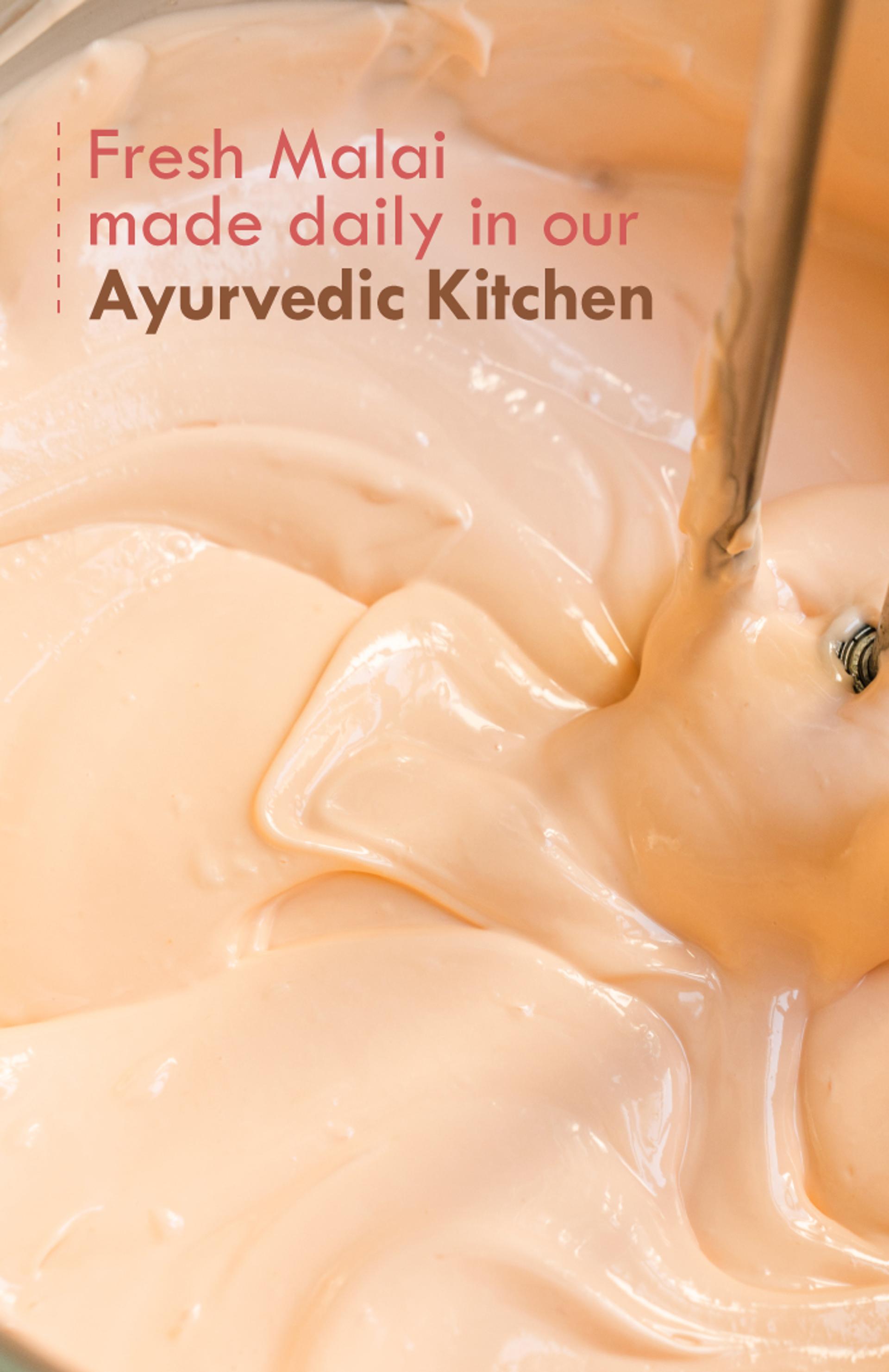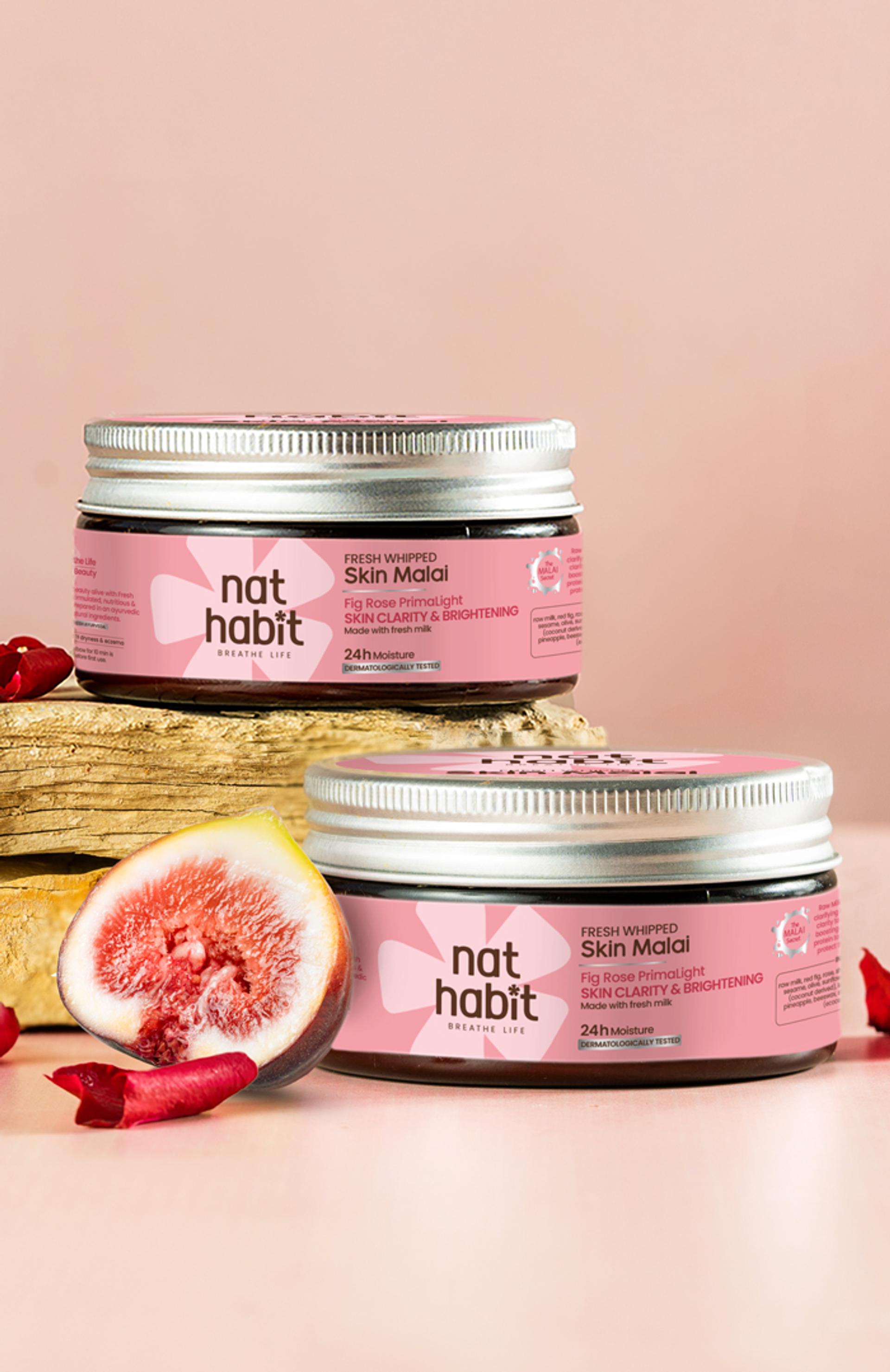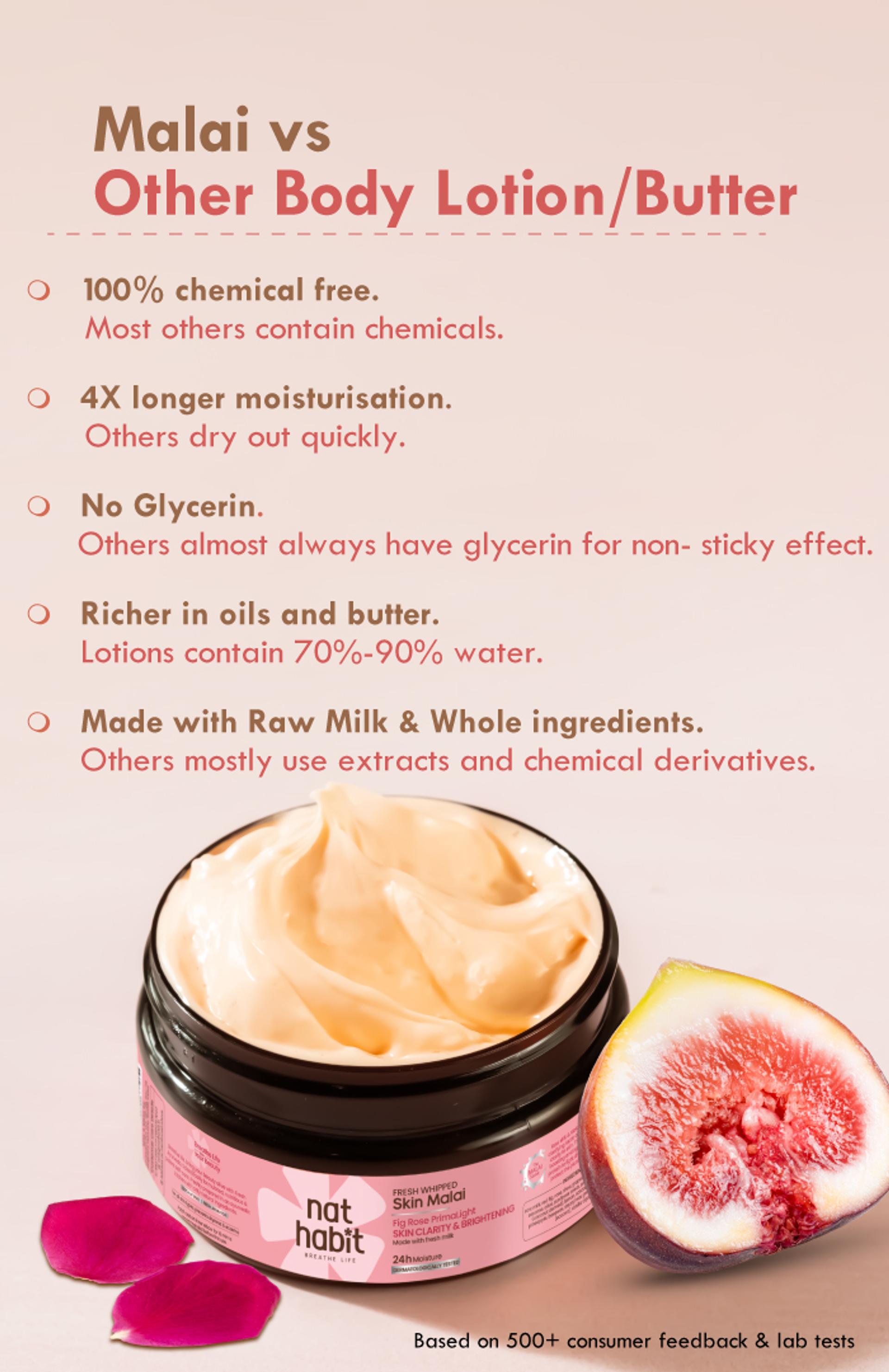 Malai's exfoliating enzymes remove superficial pigmented cells, promoting faster tan fading. Fig inhibit tyrosinase, reducing pigmentation while rose’s antioxidant scavenge UV-induced free radicals, protecting skin from photooxidative damage. Shea butter forms a lipid barrier that limits UV penetration and repairs photo-damaged skin.