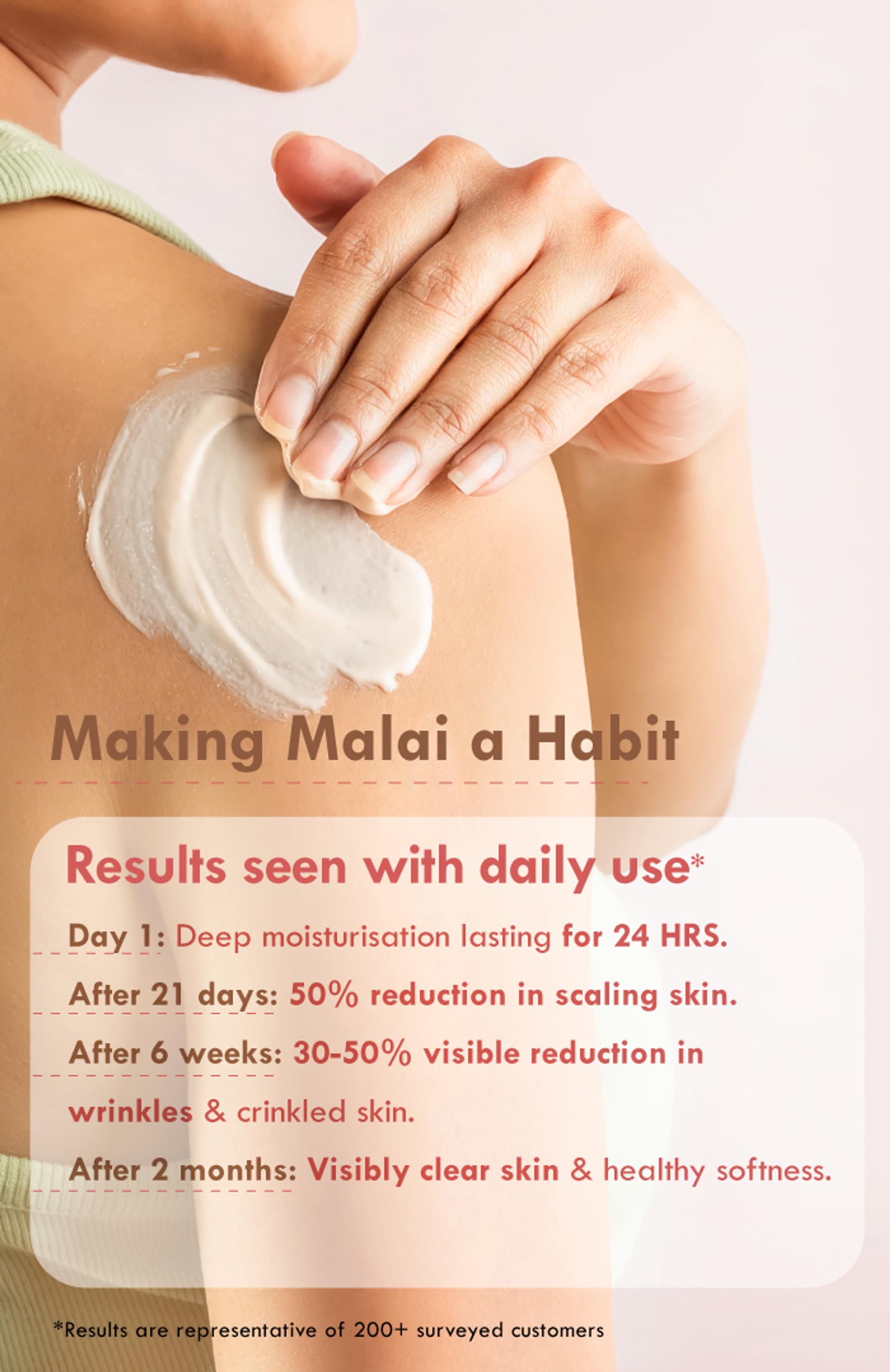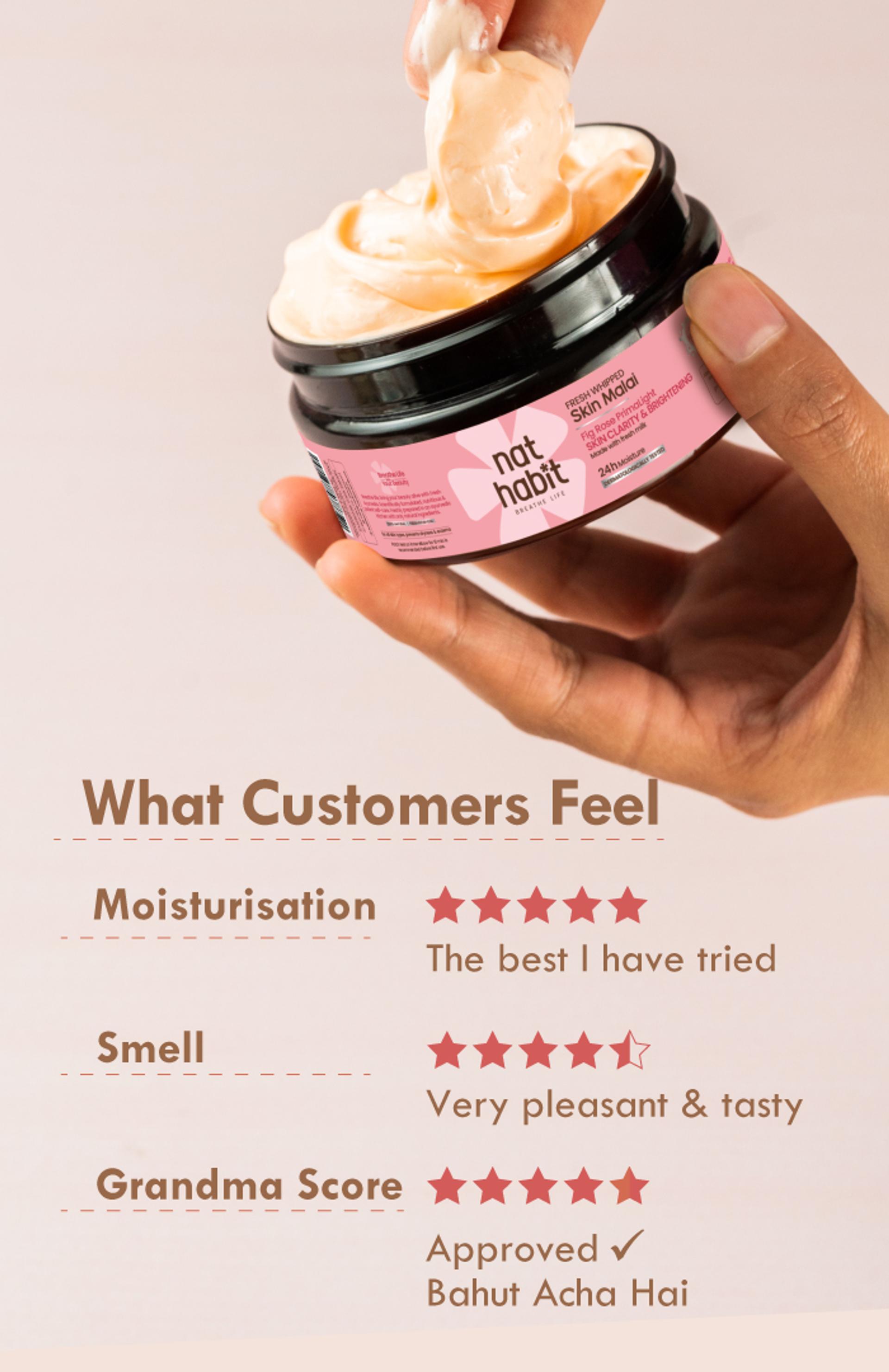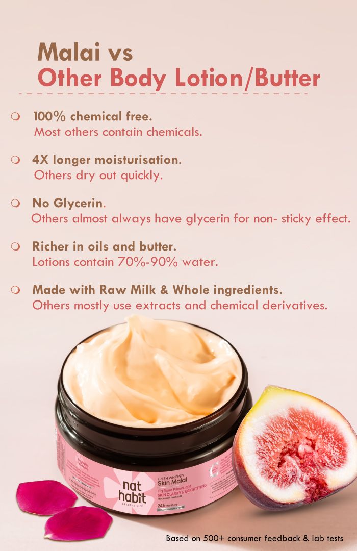 Malai's exfoliating enzymes remove superficial pigmented cells, promoting faster tan fading. Fig inhibit tyrosinase, reducing pigmentation while rose’s antioxidant scavenge UV-induced free radicals, protecting skin from photooxidative damage. Shea butter forms a lipid barrier that limits UV penetration and repairs photo-damaged skin.