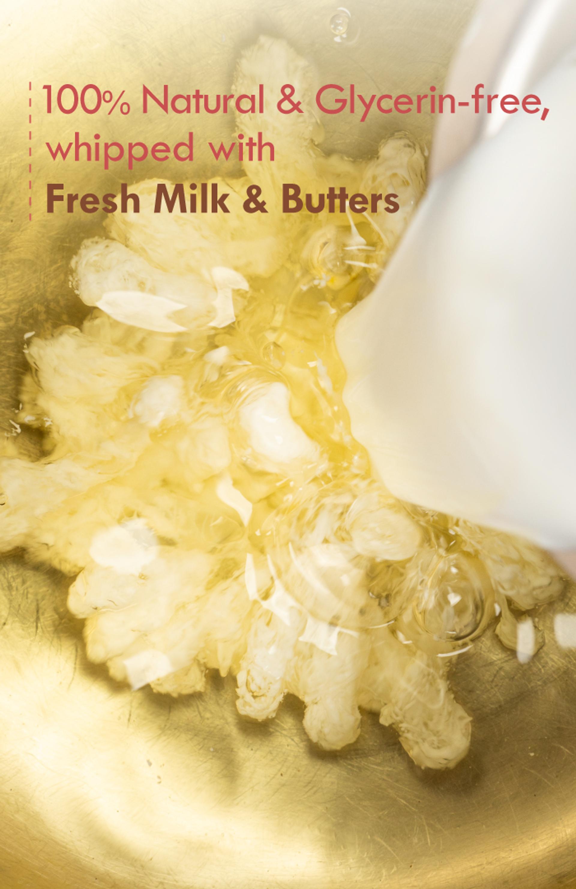 Rose improves skin microcirculation and promotes lymphatic drainage. Shea butter smooths the skin surface, enhancing natural glow while raw milk refines texture and brightness, preserving skin lipids from oxidative damage, maintaining a healthy, luminous sheen.
