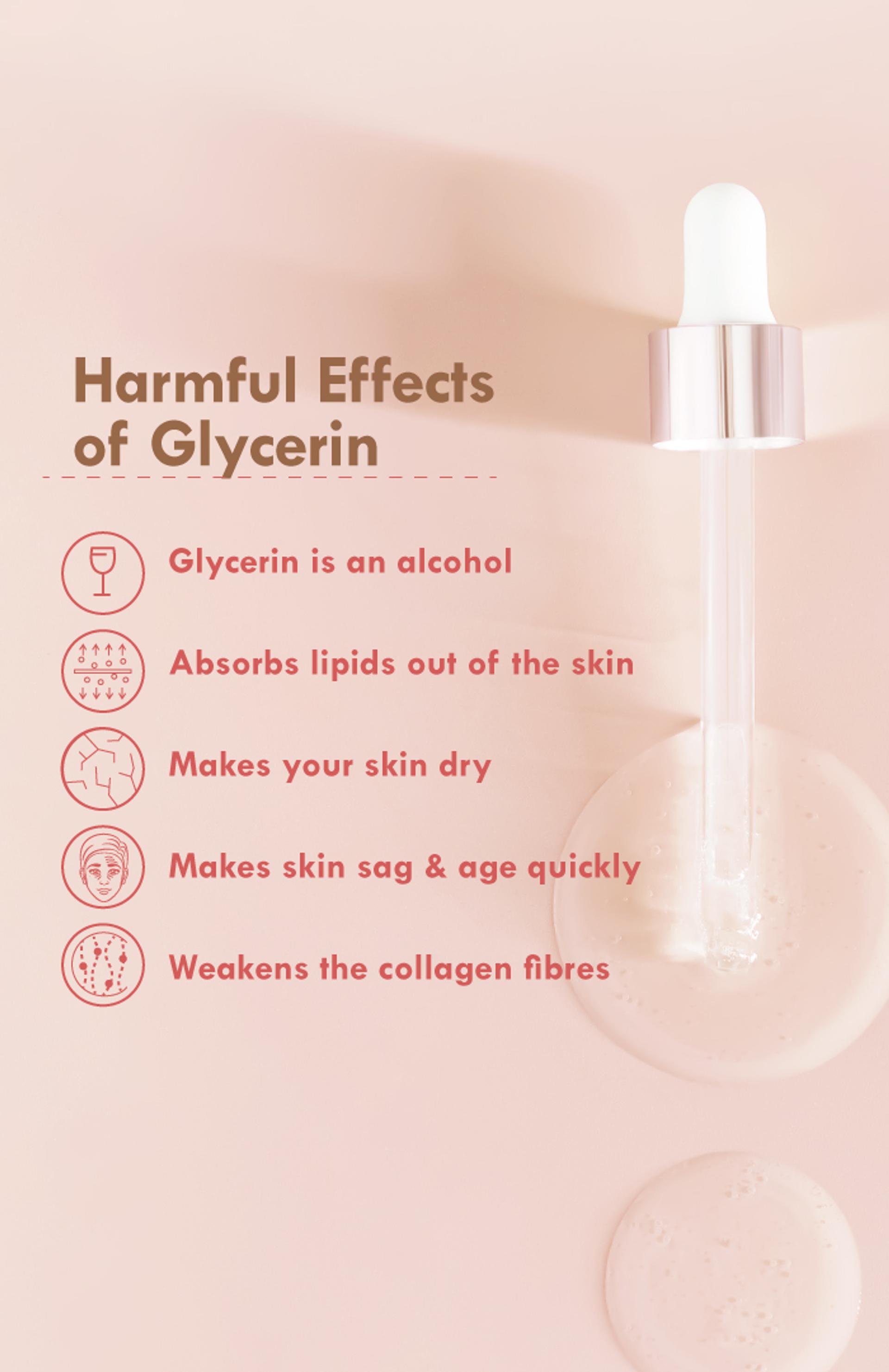 Glycerin often gives the illusion of moisturised skin because it makes the surface feel soft and supple immediately after application. However, this is often superficial and short-lived. In reality, it may leave the deeper skin layers more vulnerable.