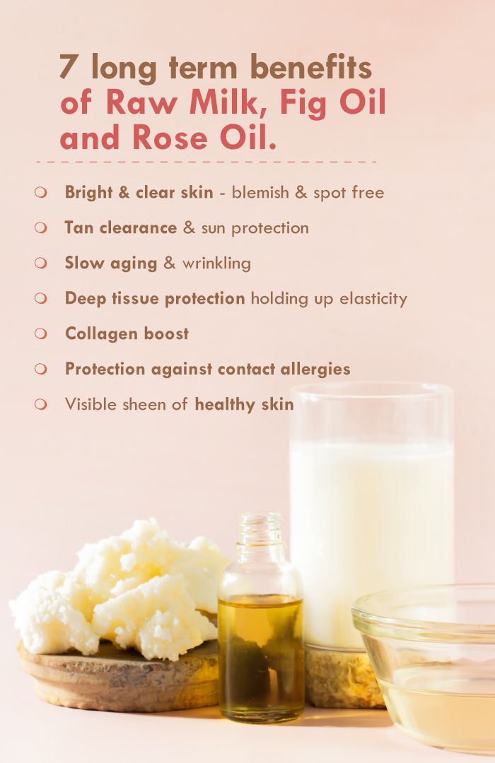 Shea butter help slow down the degradation of collagen and elastin. Raw milk enhances skin renewal, rose & fig prevent oxidative stress that accelerates wrinkle formation, preserving dermal integrity.
