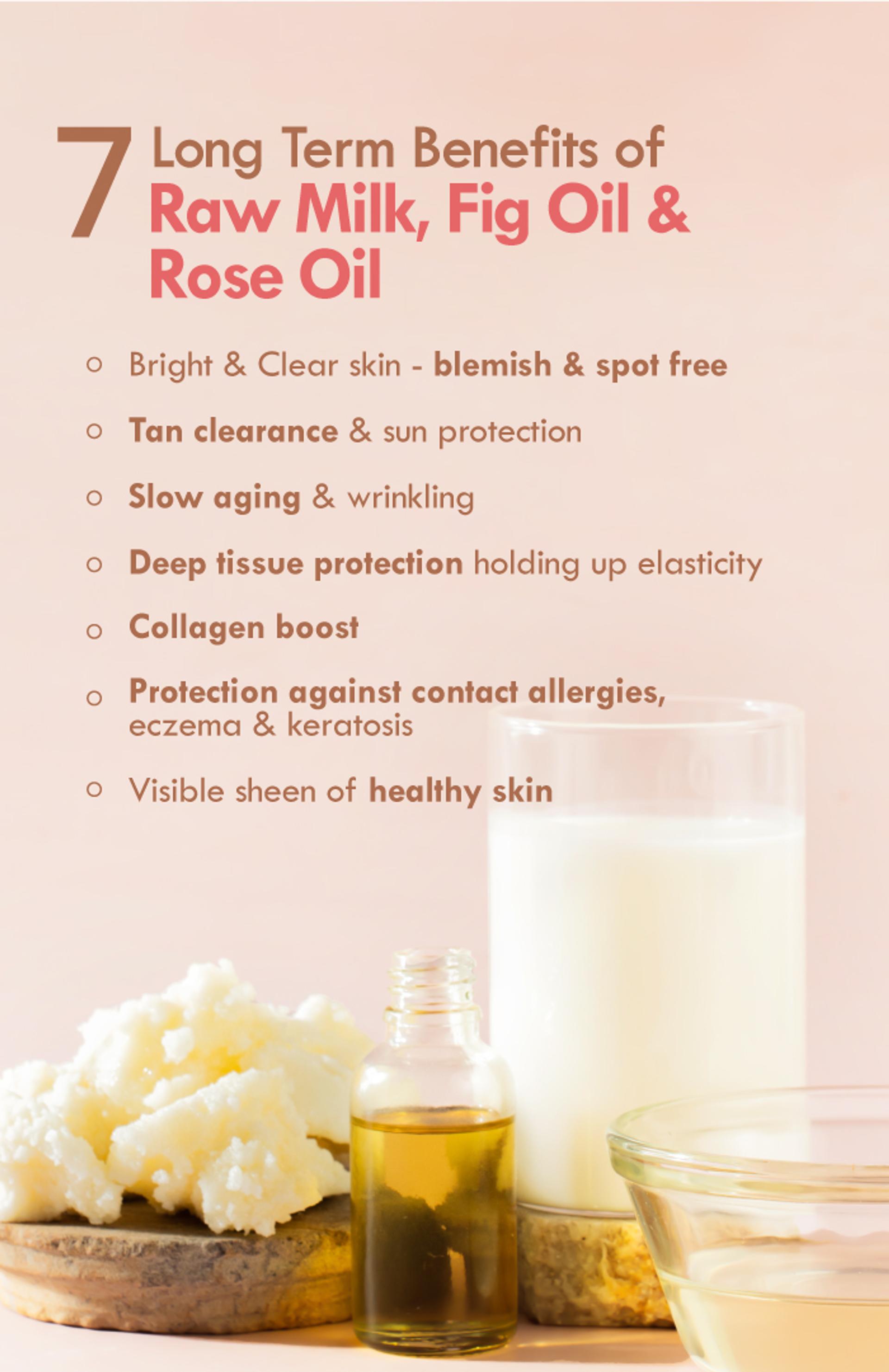 Raw milk enhances skin renewal, rose & fig prevent oxidative stress that accelerates wrinkle formation, preserving dermal integrity.