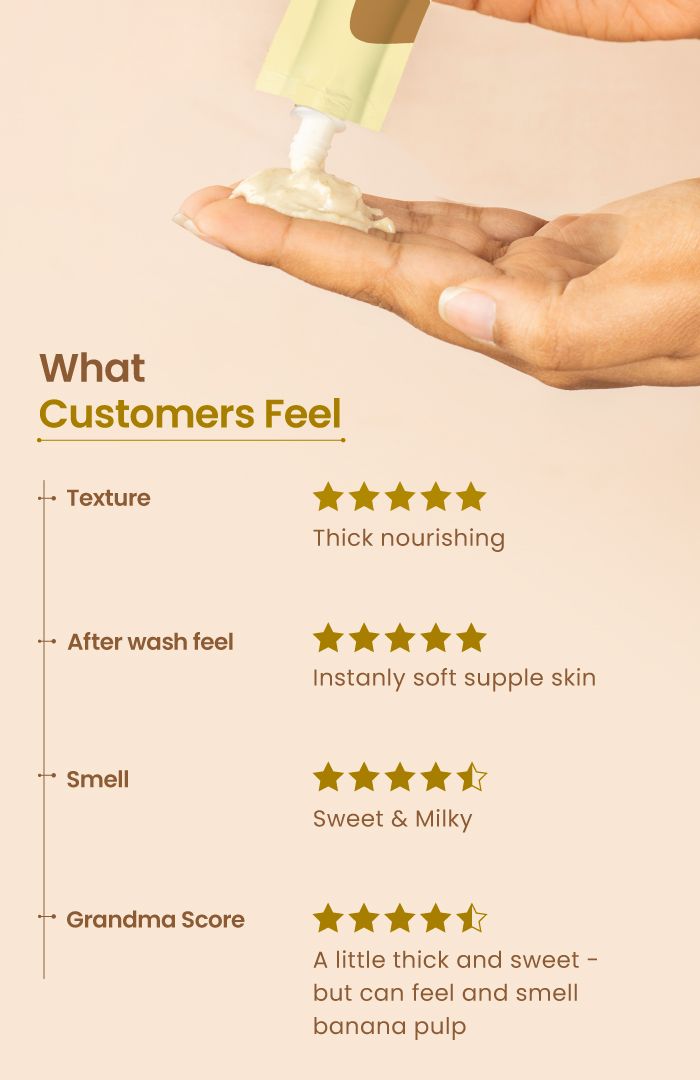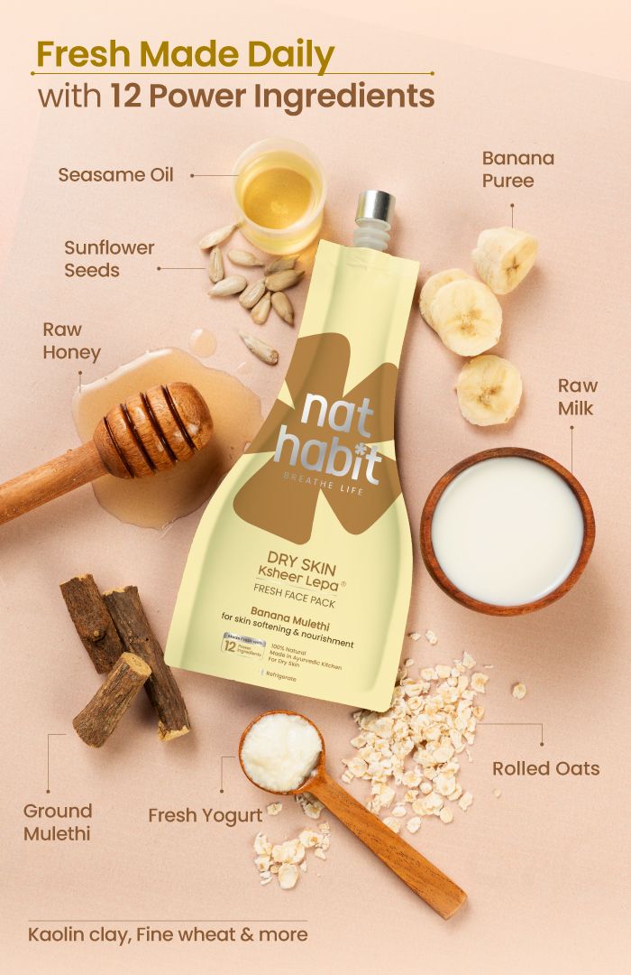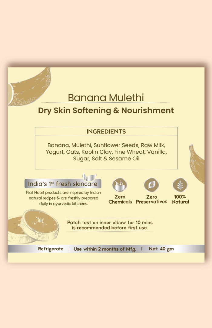 Made fresh in our Ayurvedic Kitchen with 12 powerful ingredients, this Banana Mulethi Lepa face pack softens dry skin and delivers deep nourishment with rich, moisturising phyto-actives. Banana’s emollient fibres replenish lost moisture, restore suppleness, and smooth rough texture, while Mulethi’s flavonoids calm dryness-induced inflammation, brighten dull patches, and support even-toned nourishment to revive moisture balance and leave skin velvety-soft from the deepest.